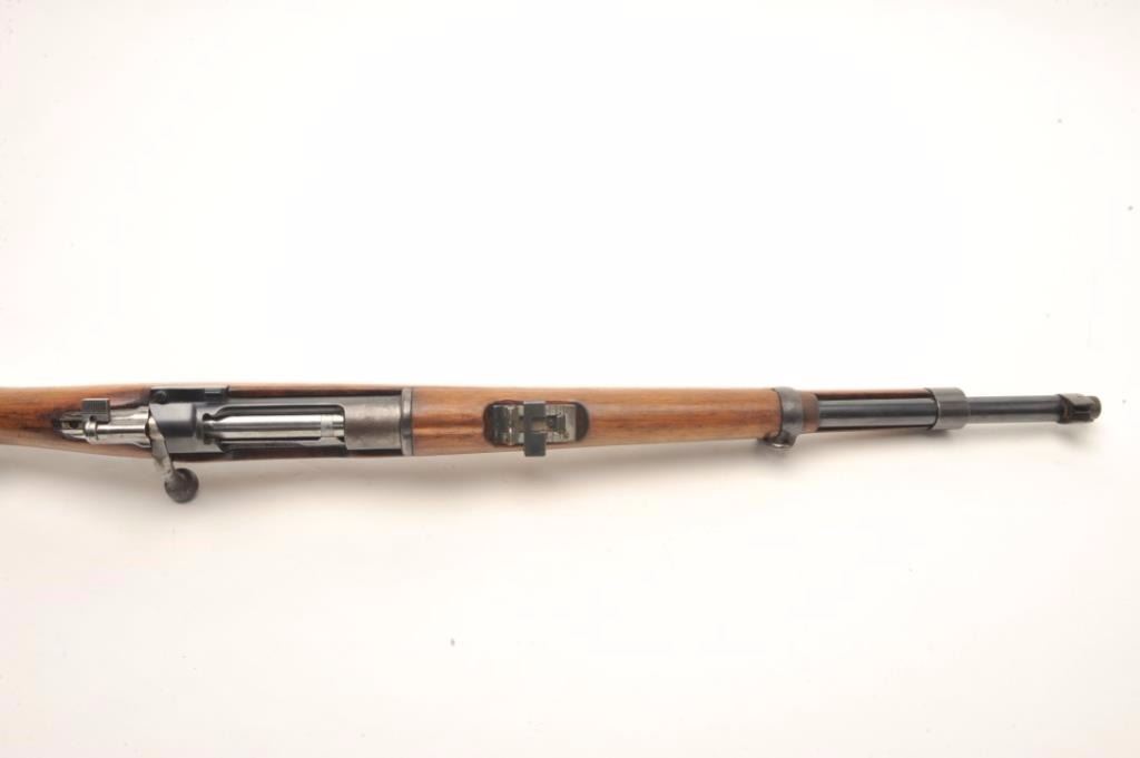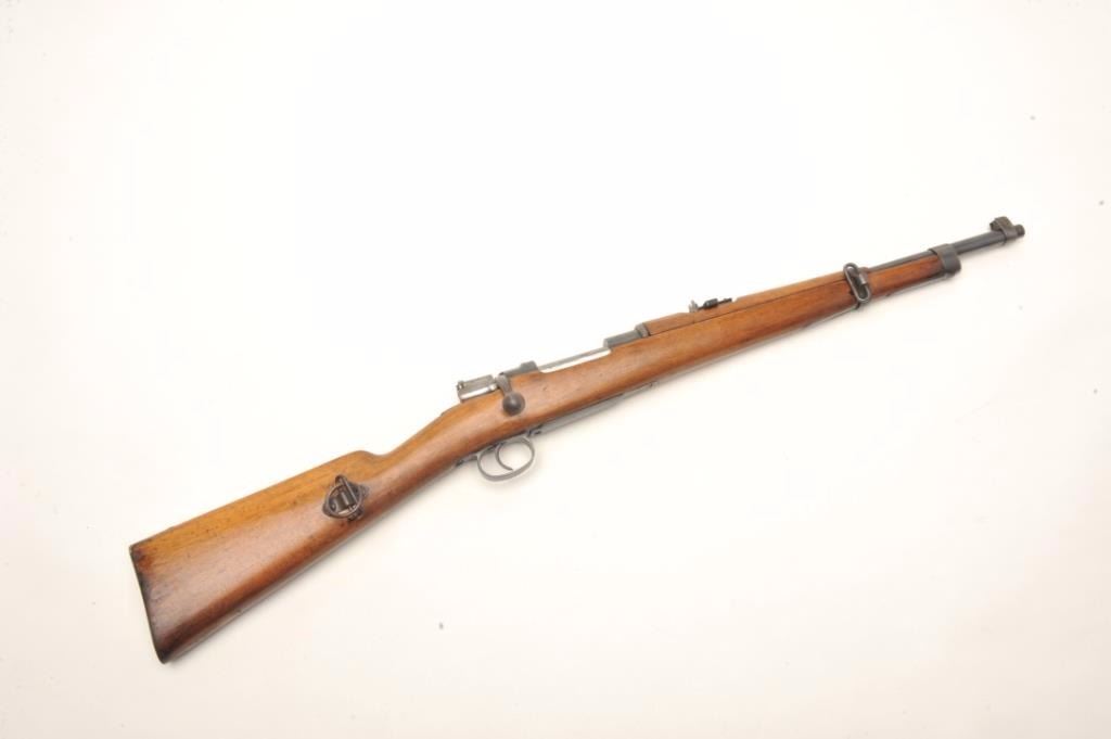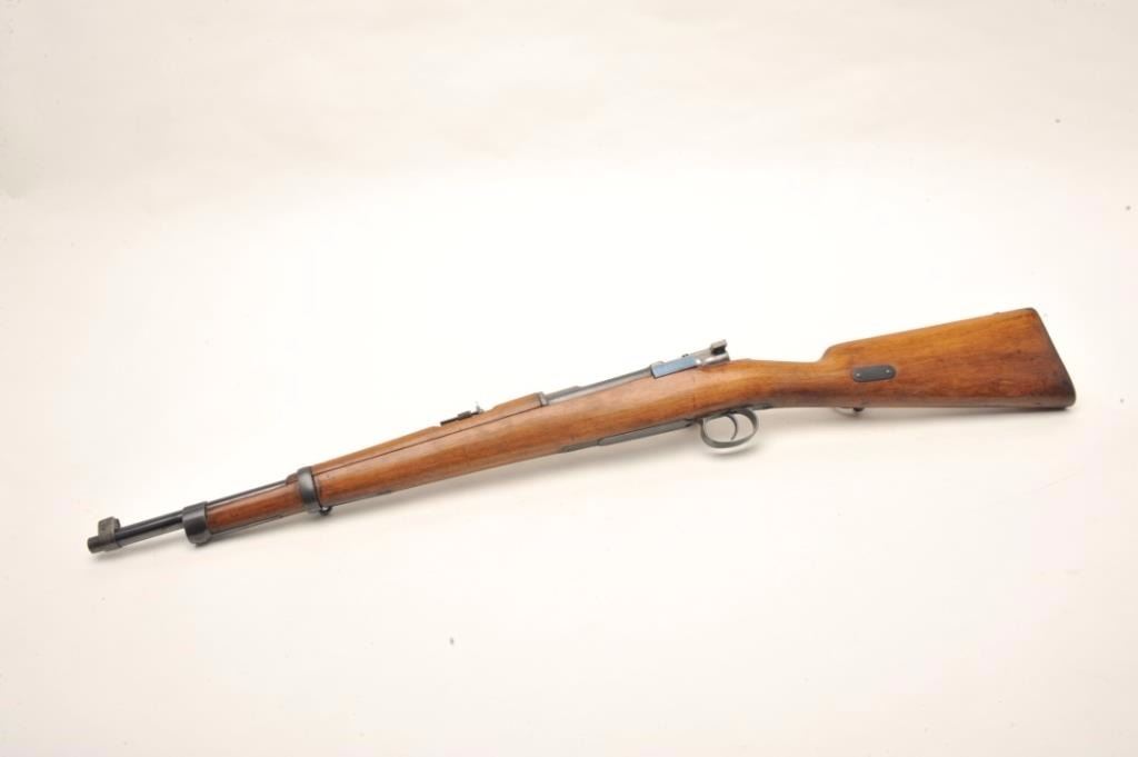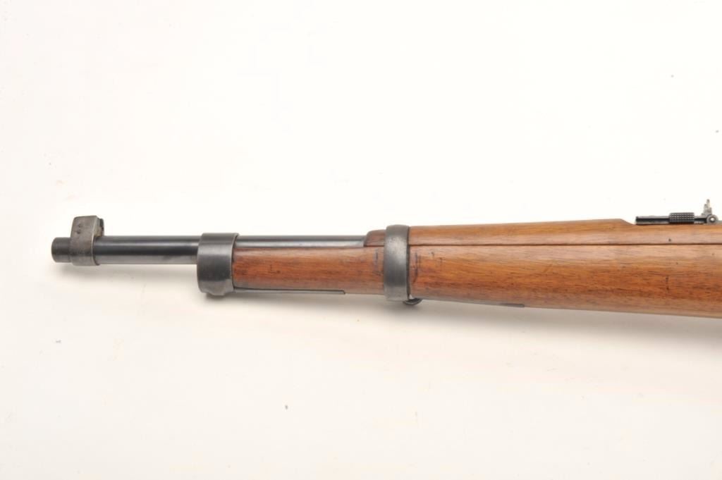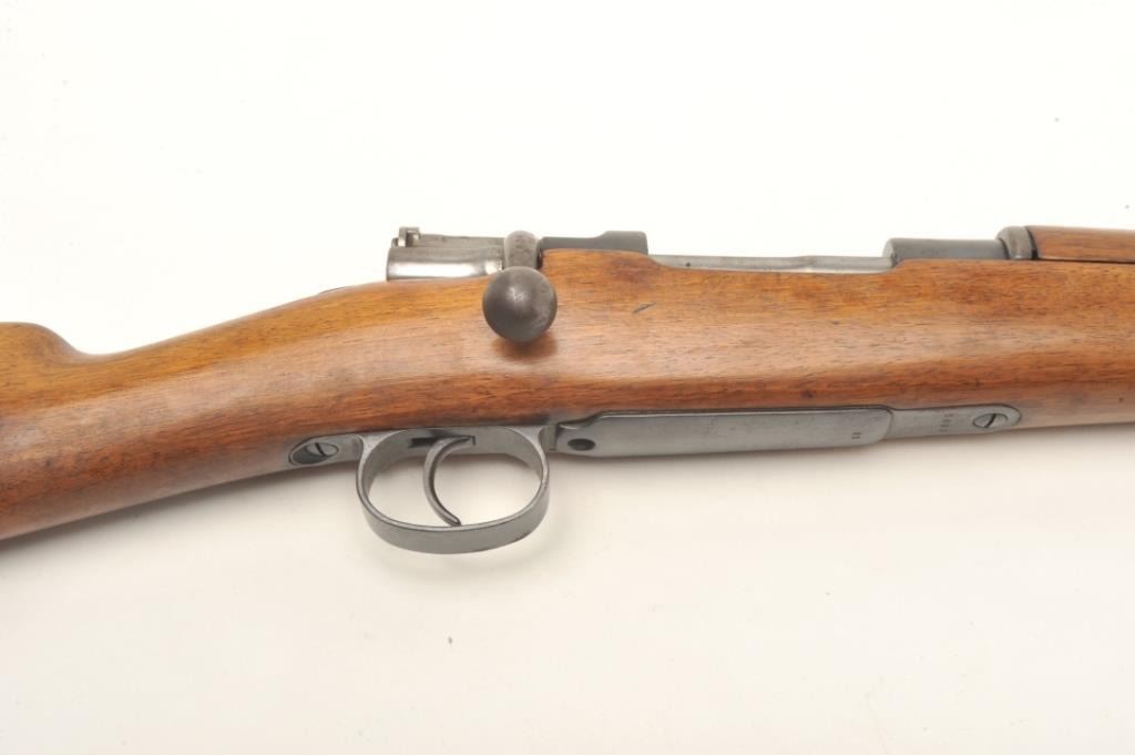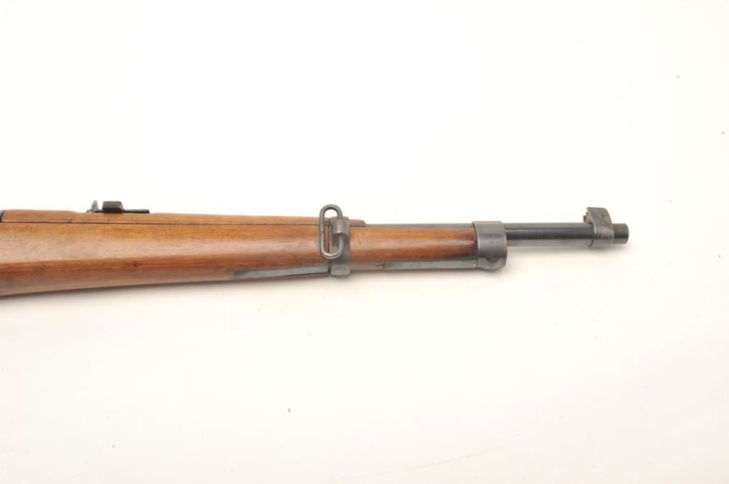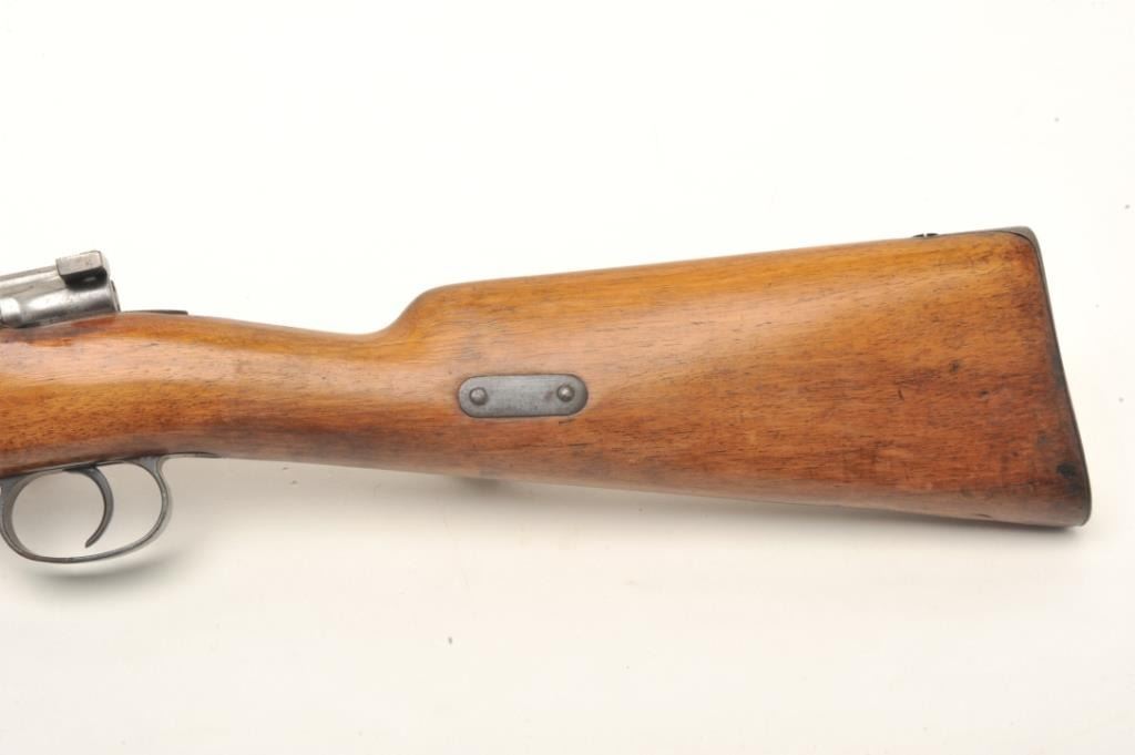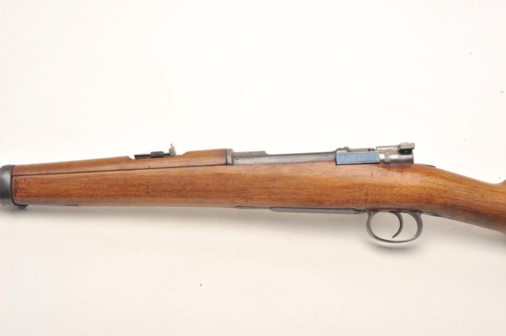 Mauser bolt action carbine, 7mm caliber, 18.5” barrel, blued finish, wood stock, S/N 5093, in overall good to very good condition with crest on top of receiver ground off some time ago, good bore, action, markings andwood. Interesting old tag attached to butt stock saddle ring stating “This Mauser carbine rifle is a gift from President Francisco Madero of Mexico to Edward H. Campbell in appreciation of services rendered to the Republic of Mexico in Mexico City in the year 1912 at Chapuletepec Castle”. Should be further researched. (C&R). Est.: $300-$600.