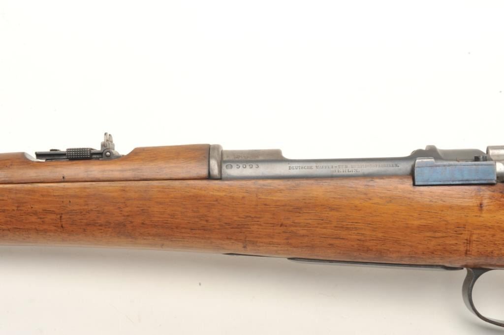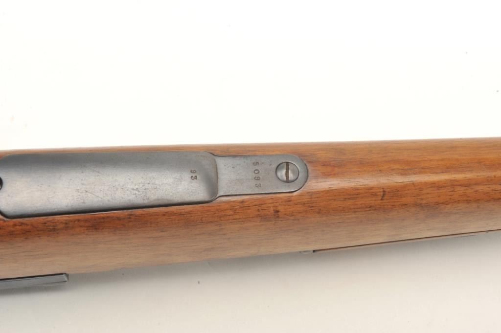 Lot 828 Mauser bolt action carbine, 7mm caliber, 18.5” barrel, blued finish, wood stock, S/N 5093, in over
