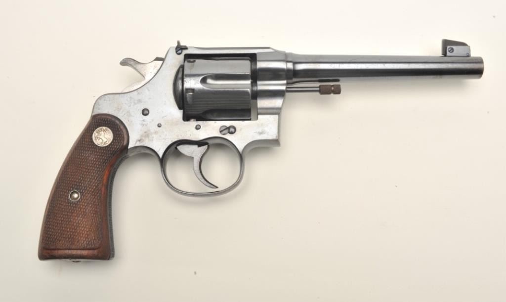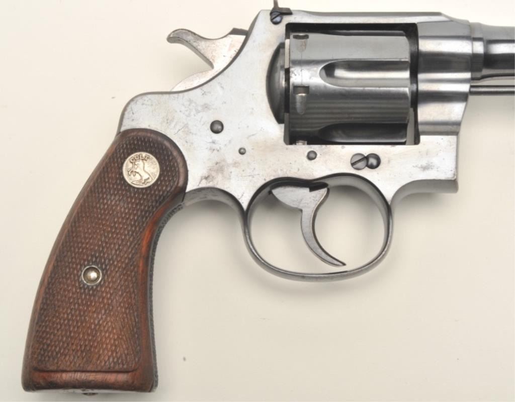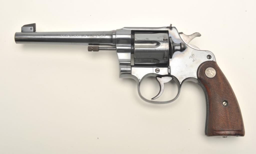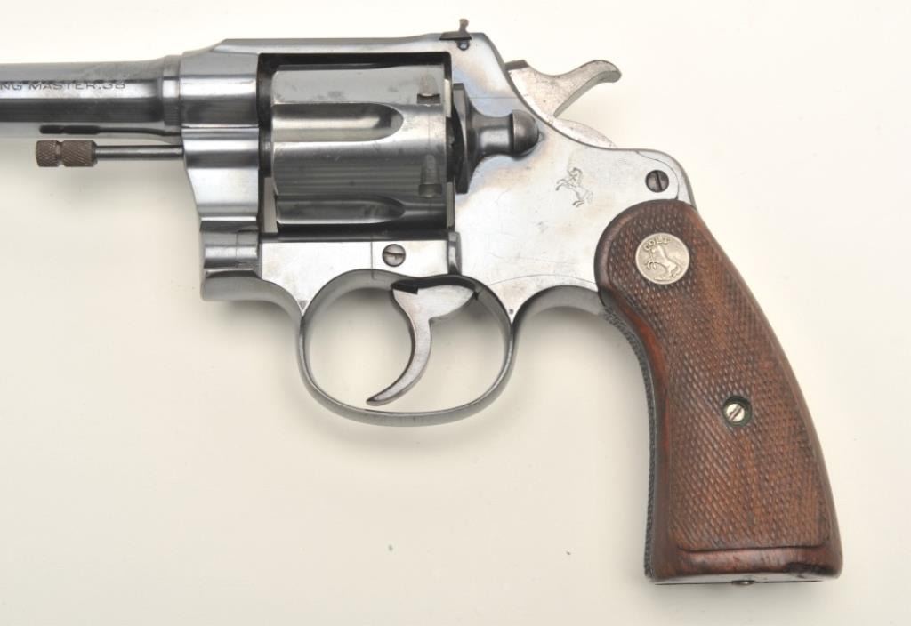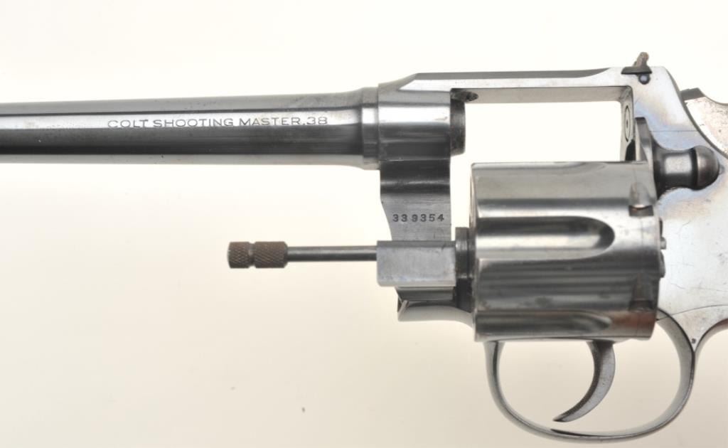Colt Shooting Master DA revolver, adjustable sights, .38 caliber, 6” barrel, blued finish, checkered wood medallion grips, S/N 339354, in overall minty condition with slight muzzle wear, crisp action and markings, beautifulbore, grips show some old dings at the butt area from storage; checkered straps and trigger. (C&R/PPT). Est.: $1,750-$3,500.