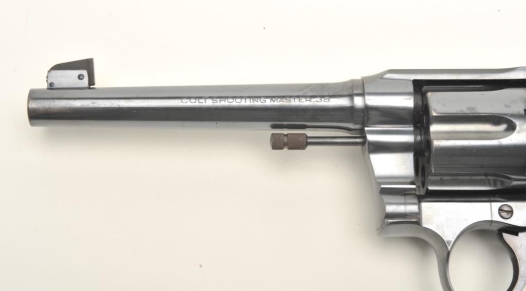 Lot 834 Colt Shooting Master DA revolver, adjustable sights, .38 caliber, 6” barrel, blued finish, checker