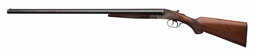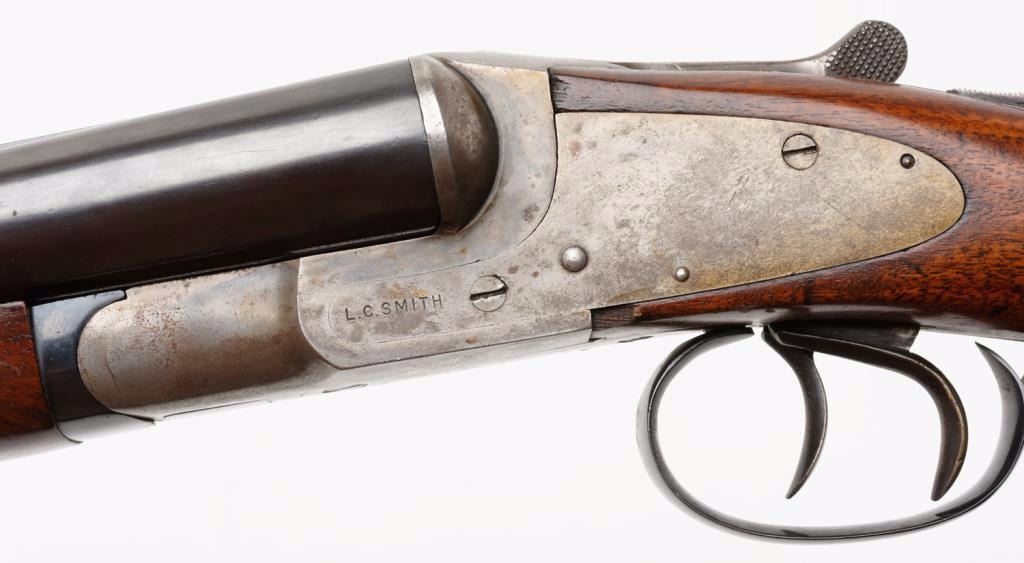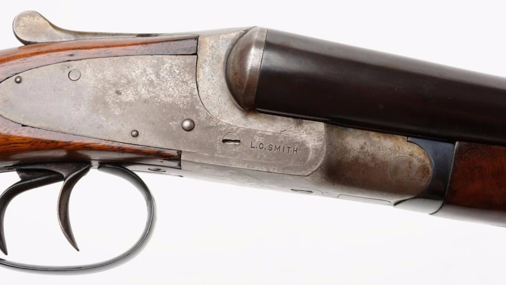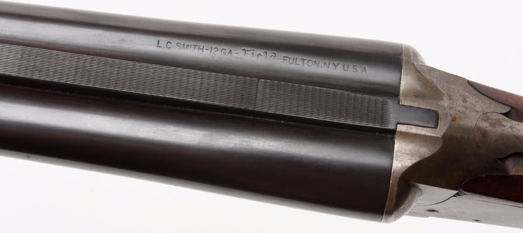 L. C. Smith Field Grade 12 gauge double barrel shotgun, 30" barrels, double triggers, standard extractors, pistol grip stock, in very good original condition, serial #S5277, with armor steel marking on bottom of barrels and Fulton New York address with no Hunter Arms. The barrels retain 95%+ original blue finish, some erosion, and a bad dent in right barrel 6-3/4" back from the muzzle. The frame shows 10-20% case hardening drifting to patina; the stocks are very good+ with some better than average grain for a slightly select grade. The right barrel is choked modified, left barrel is improved modified. The action is tight, bore is good other thanmentioned dent, which is fixable.Est.: $900-$1,800