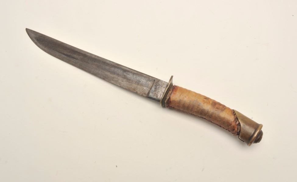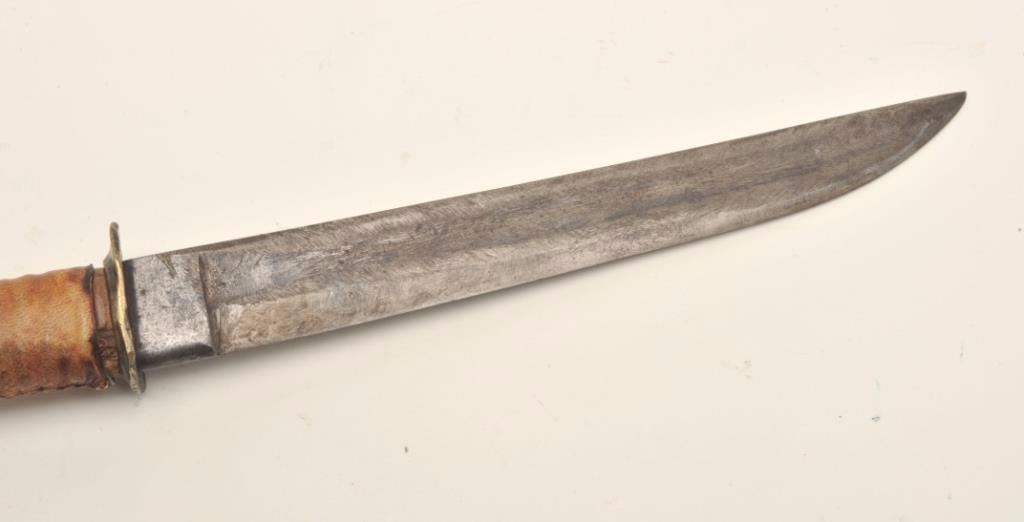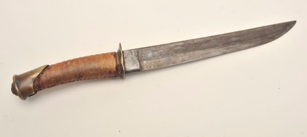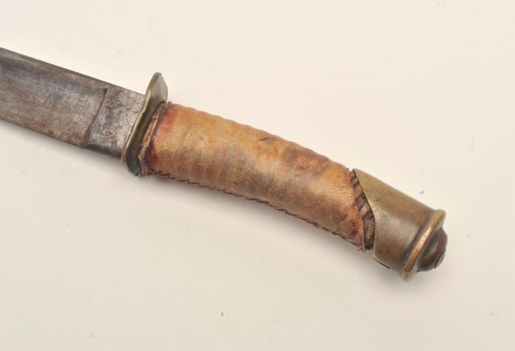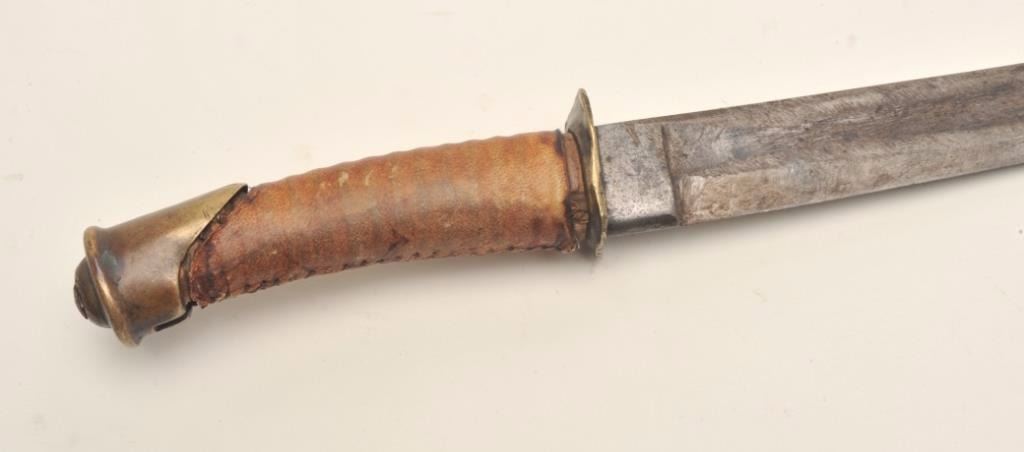 Indian knife made from a Cavalry saber with Indian tanned and wrapped grip, approximately 15” overall with a 10” blade; provenance per consignor: Walt Moreau of San Francisco, CA. Est.: $2,000-$4,000.