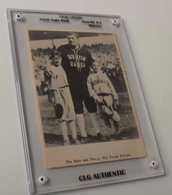 Collectors hoard of baseball-related items including: 1. A very early photo of 2 men with gloves and ball; 2. An early photo of a boy with a bat and ball; 3. The “Babe” 1930 Conlin in Lucite graded gem MT; “The Babe and two of his young friends”; 4. Proof printer’s plate of baseball player P. Flynn for tobacco cards, 7” x 5” in original titled envelope; 5. Proof printer’s plate of baseball player Matthews-Athletics fortobacco card, 7” x 5” in original titled envelope; Great for the baseball collector. Est.: $1,250-$2,500.