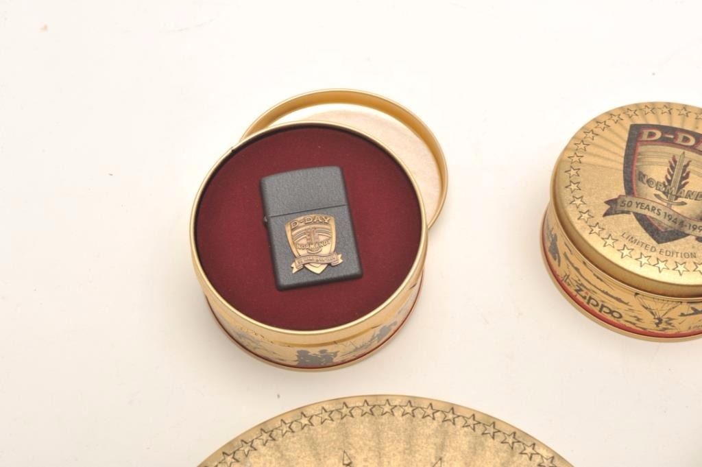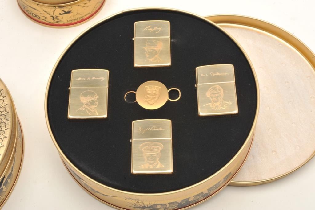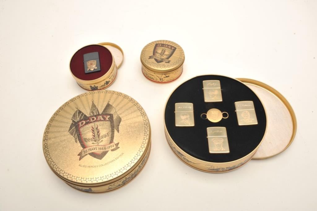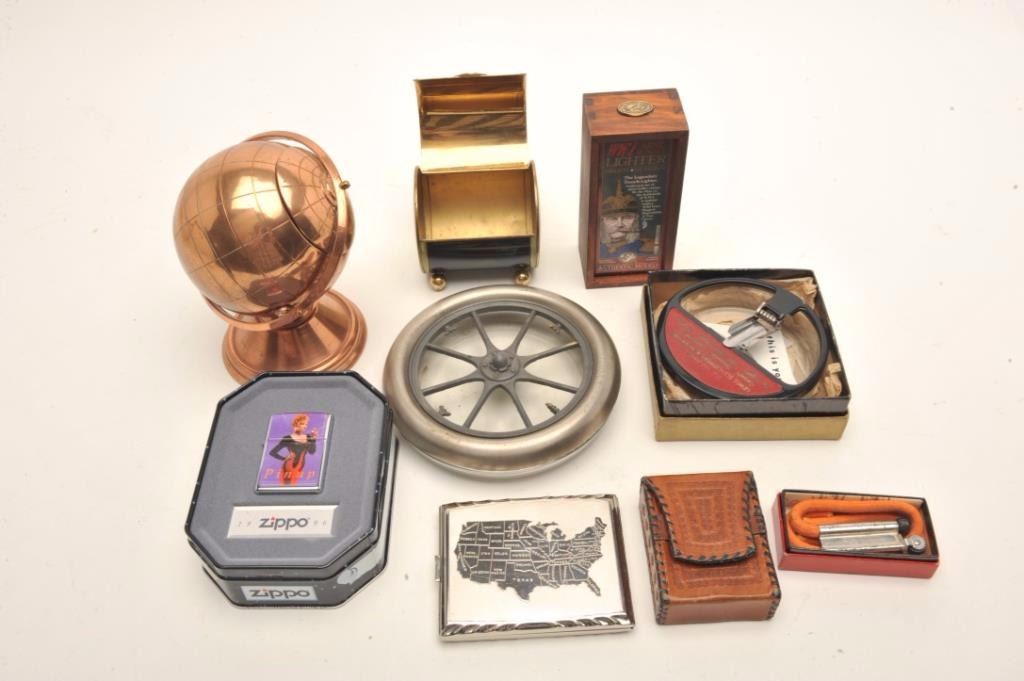 Misc. lot of vintage and collectible lighters and combination lighters/cigarette cases including a number of military-related themes like Zippo’s D-Day Allied Heroes Collectors Edition set in a tin with 4 brass-finishedlighters with a key chain in the center (ca. 1944) and containing the likenesses of General Montgomery/General Bradley/General Eisenhower and General DeGaulle; also a copper desktop globe cigarette holder; 2limited edition D-Day commemoratives; several ashtrays, a variety of advertising accessories, etc. (Reference: James Flanagan’s definitive work “The Big Book of Cigarette Lighters”). Est.: $400-$600.