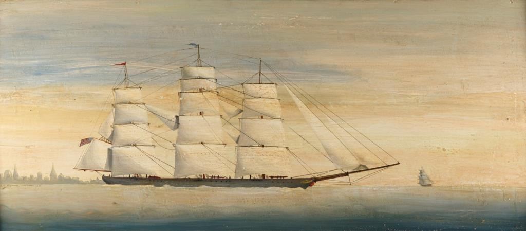 Oil on board of Clipper Ship flying the American Flag signed lower left S.R. Deiss, 1875 also (Sacanagy) probably town in Europe but spelling and letters not discernable. approx. 13"x30 1/2". Est: $2,000-4,000