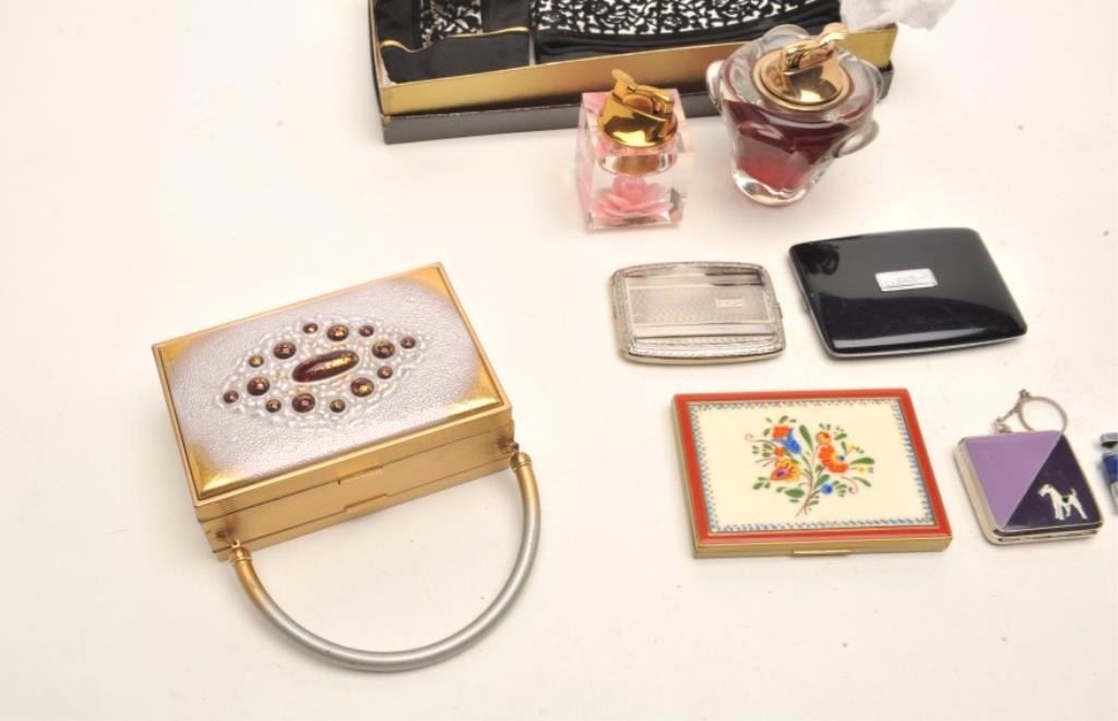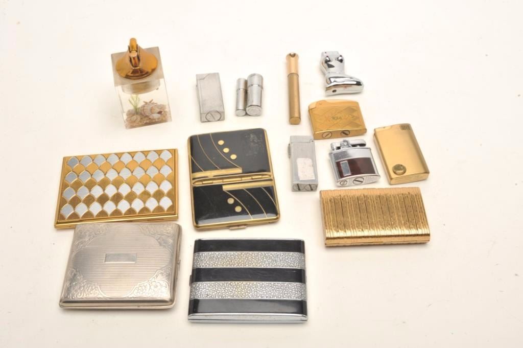 Misc. lot of vintage and collectible cigarette cases and lighters including a clutch purse by Evans with cigarette and grooming accessories inside; several tabletop glass base lighter, one with small seashells inside the base; a couple of fancy compact cases and more. (Reference: James Flanagan’s definitive work “The Big Book of Cigarette Lighters”). Est.: $250-$500.