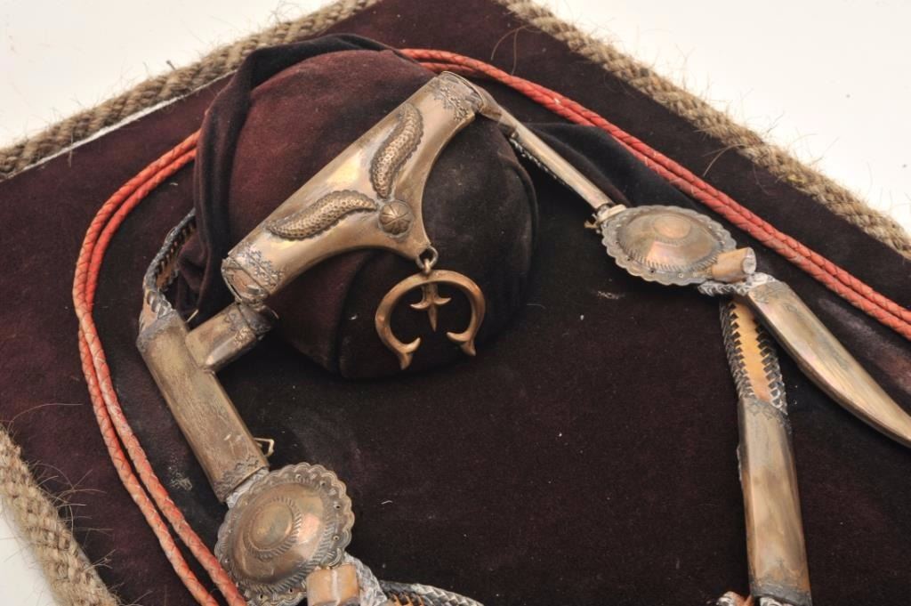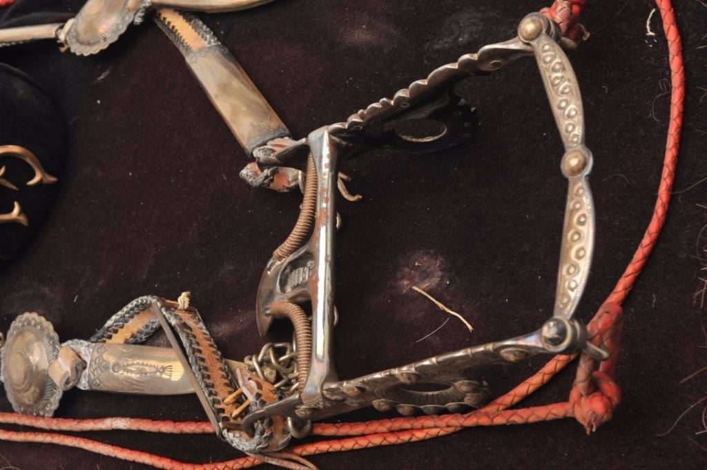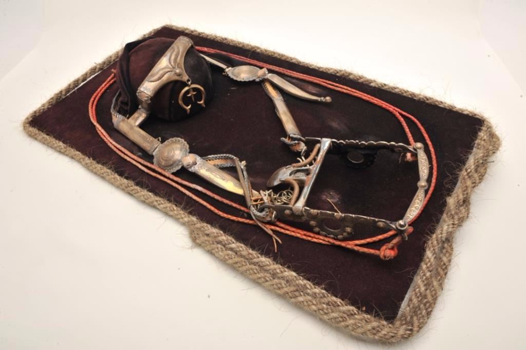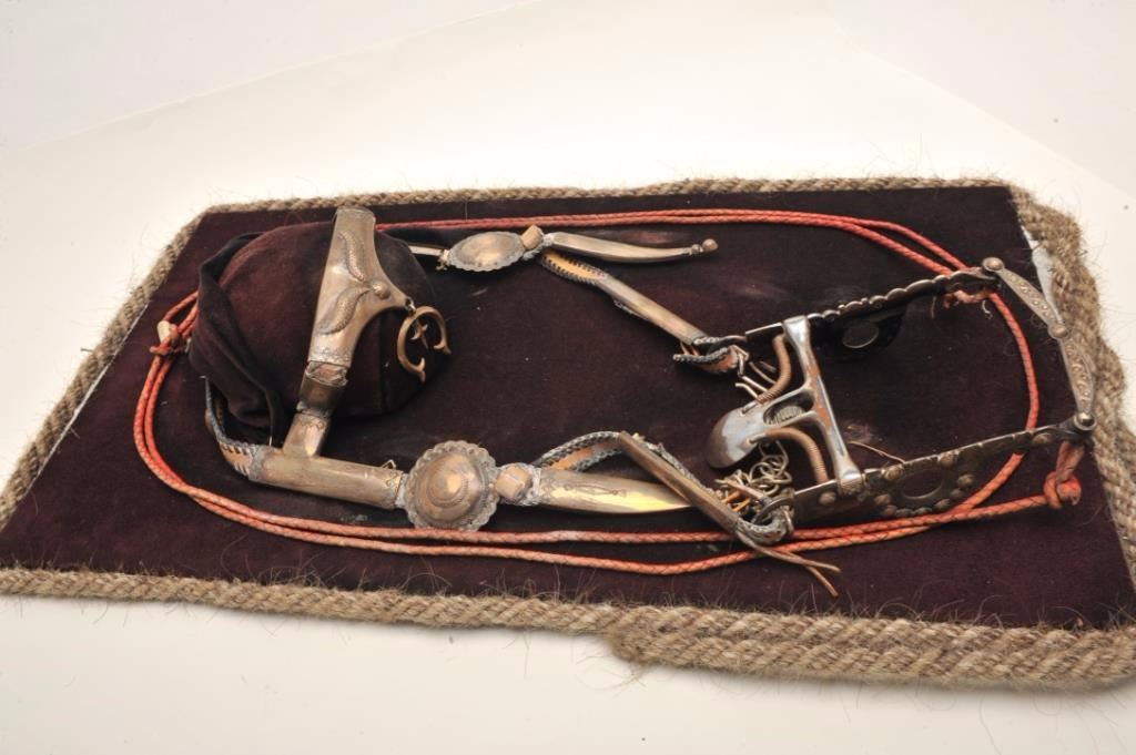 Lot 872 Uncleaned Navajo silver parade bit circa 1900-1930 mounted on a plaque. Has discolored from chemic