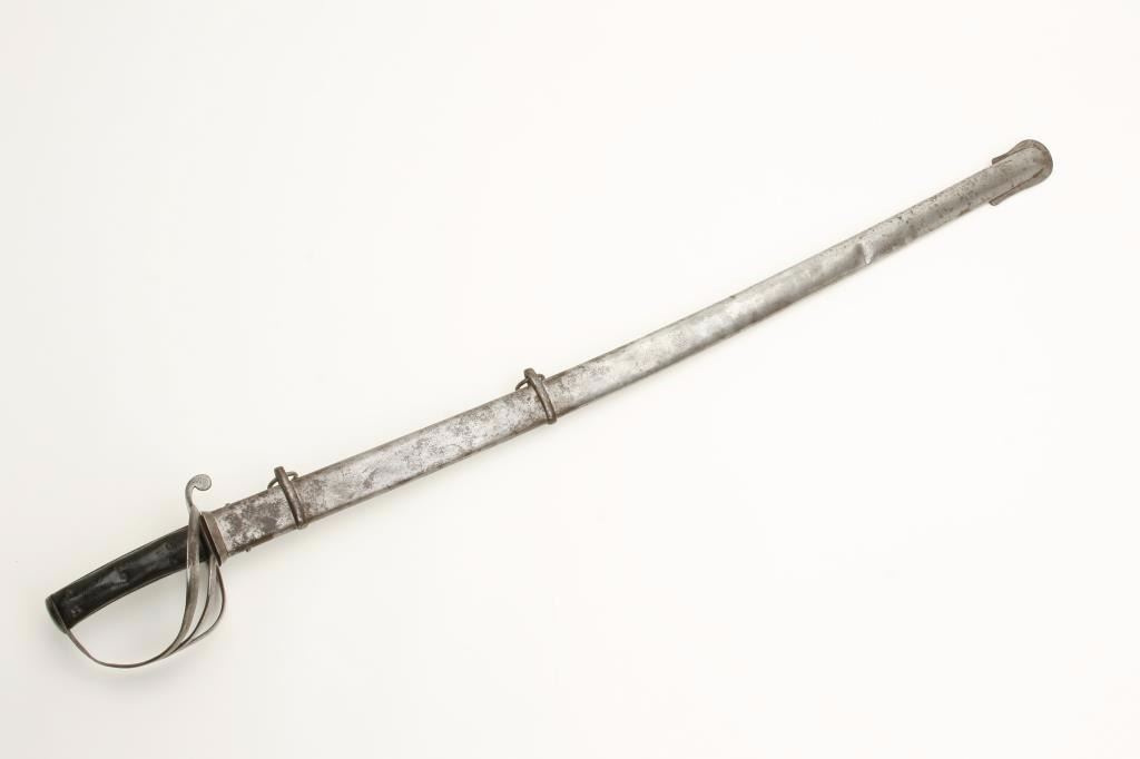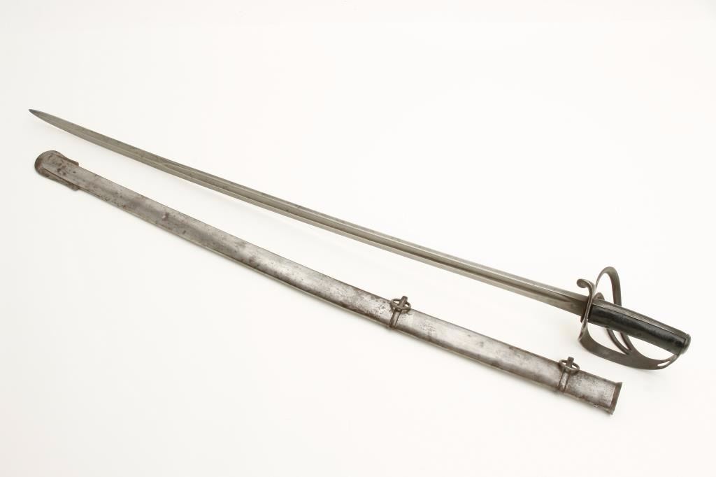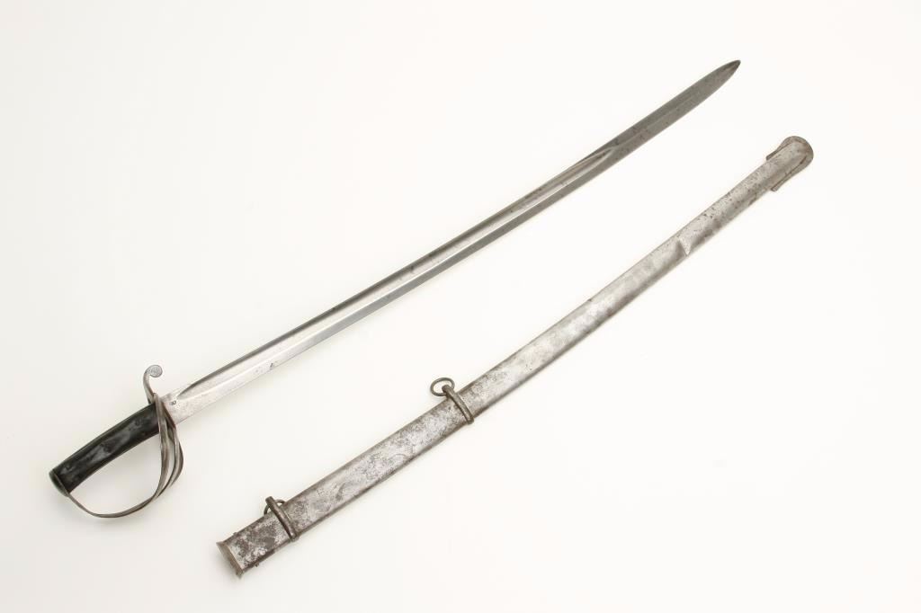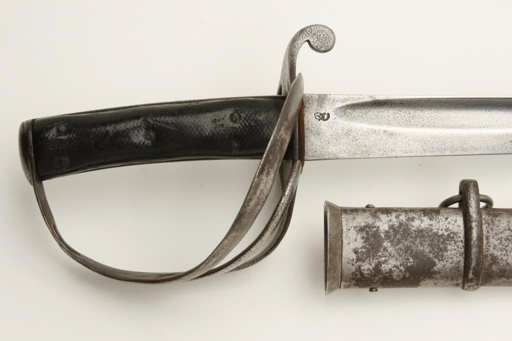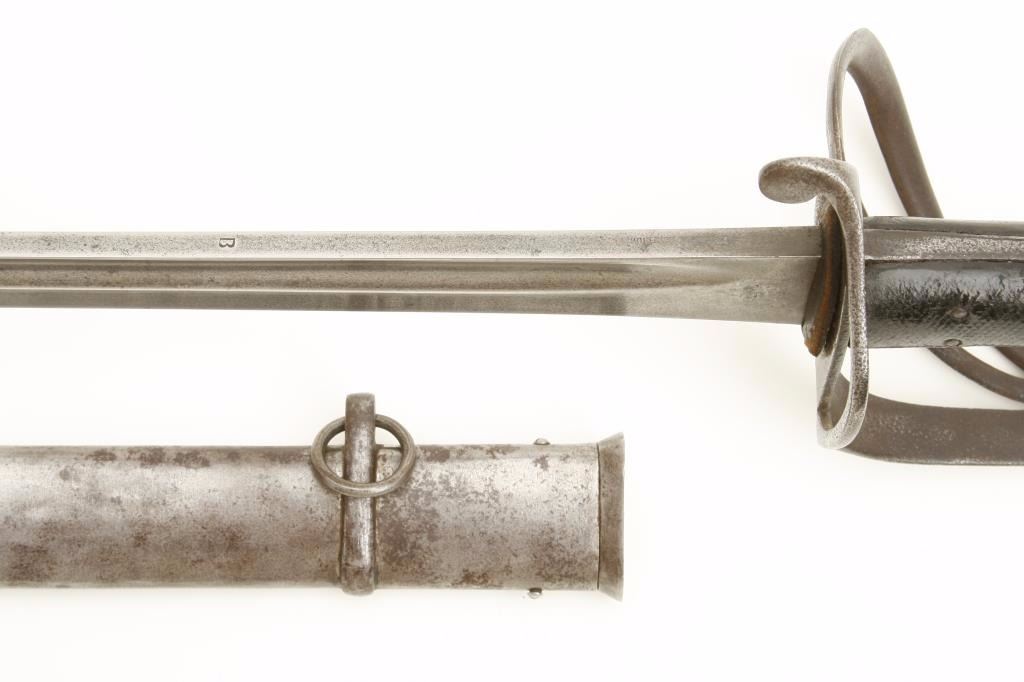 “Mole” marked Cavalry saber with scabbard probably Confederate imported with scabbard. Shows knight head mark on the blade which is generally I’d to Weyersburg or Solingen. Mole stamped on back of spine and also militarystyle “B” marking. With scabbard. In fair condition showing wear and use. Grip worn with very good blade. Est.: $800-$1600