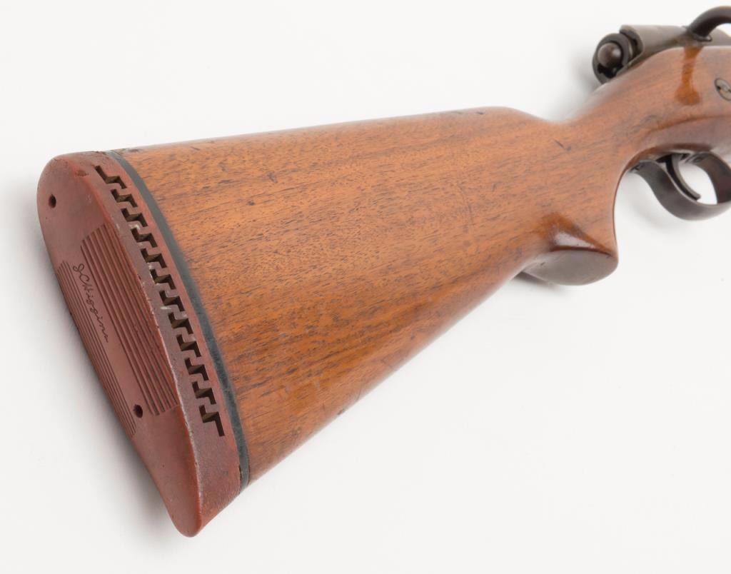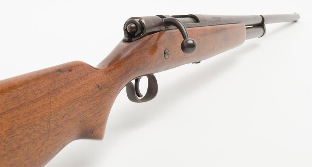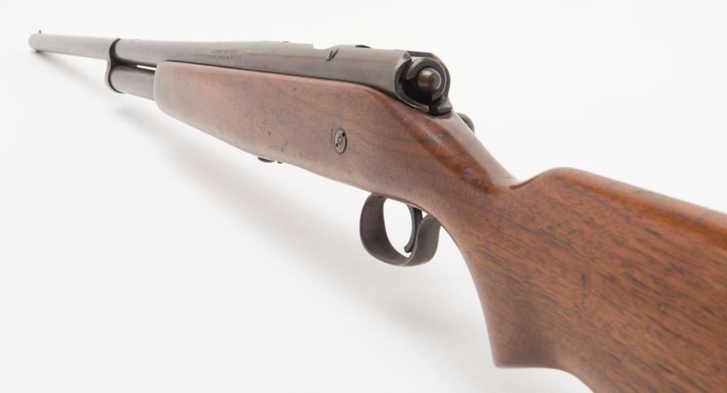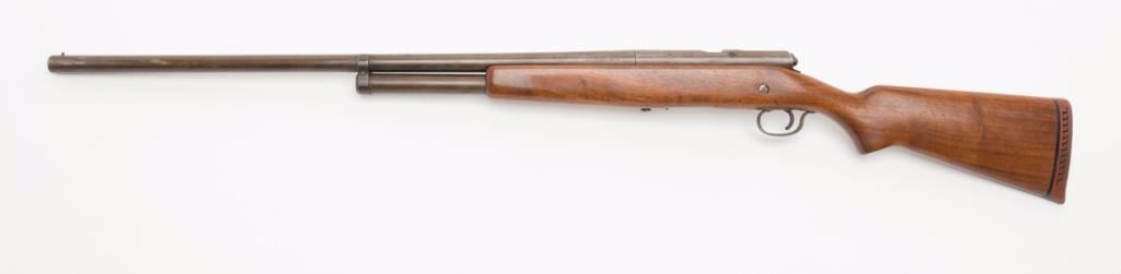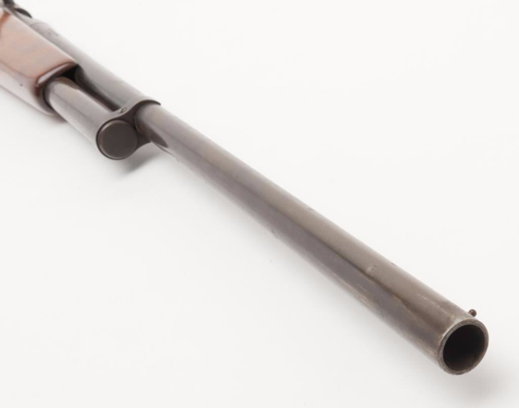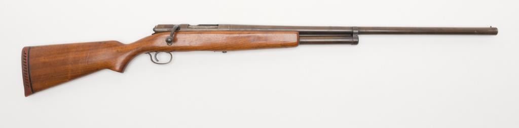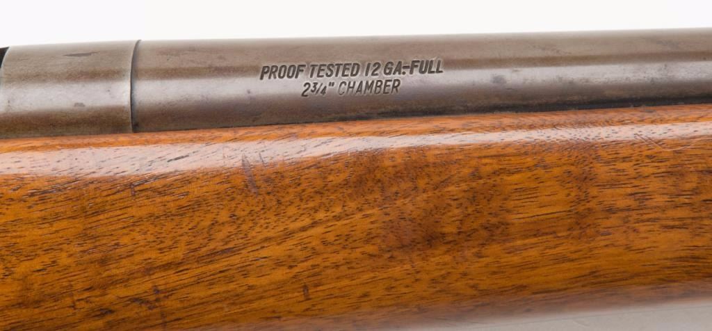 J.C. Higgins Model 583.20 bolt action shotgun, 12 gauge, Serial #NSNV. The shotgun is in overall good condition with a 28” barrel. The barrel and action retain little original blue with the majority of the finish going to a brown patina. The barrel features a half magazine and brass bead front sight and is marked for full choke. The smooth wood stocks are in overall good condition showing use and mars with a brassreinforcement under the action. The butt ends in a red ventilated rubber butt pad with a LOP of 13 3/4”. The bore is good, action crisp and markings legible on this shotgun. (Modern/PPT). Est.: $125-$250.