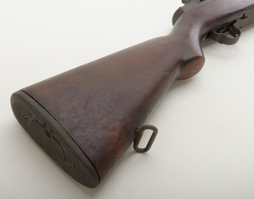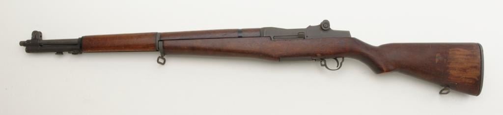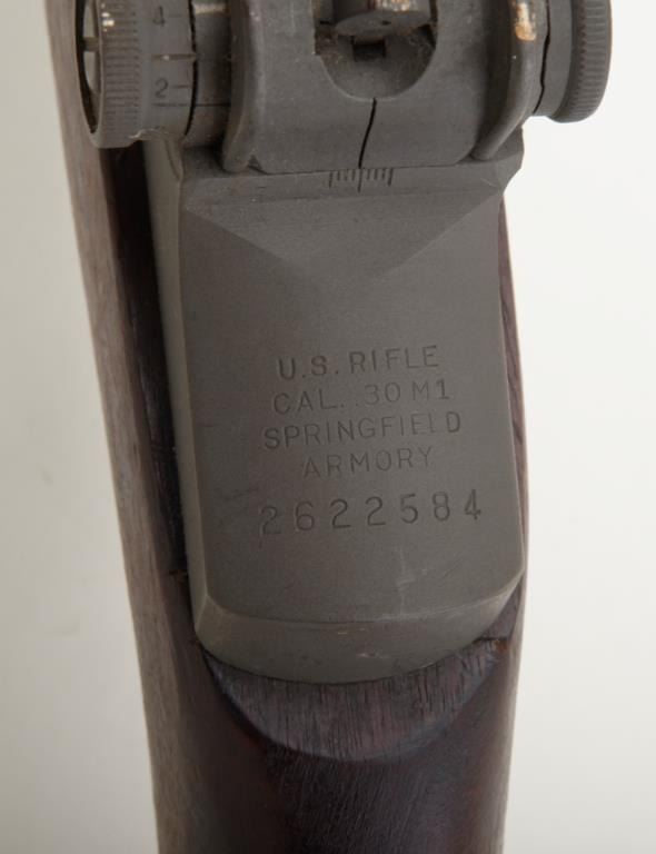 U.S. military issue M1 Garand rifle by Springfield Armory, serial number 2622584 with barrel dated 1951 and Springfield Armory marked. The metal surfaces show a patina on the parkerized finish and the left side ofthe barrel shows import marks. The stock is good with normal dings, mars, scratches and dents from military use. There are 2 proofs on the inside of the pistol grip. The action is good and the bore is good to very god andlooks like it may clean. Est.: $700-$1400