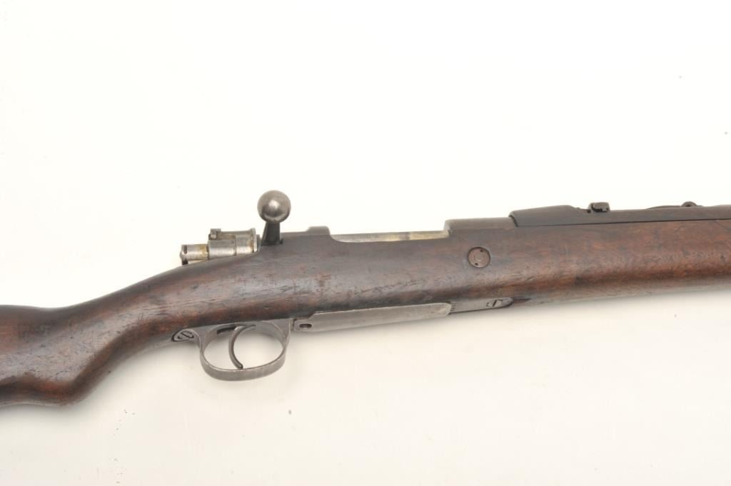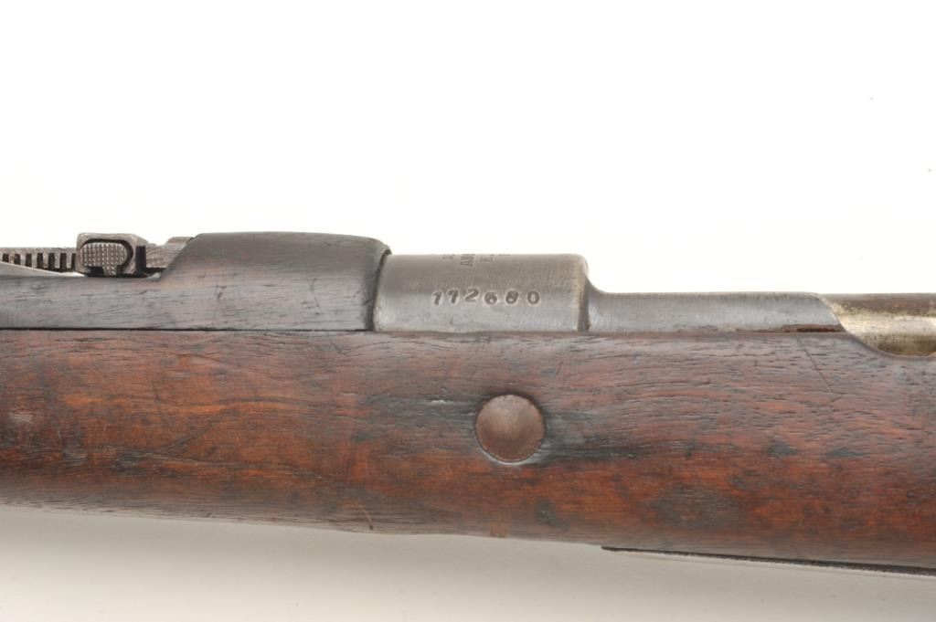 Turkish Mauser bolt-action rifle, 7.65mm cal., 30” barrel, import marked, bayonet lug, sling swivels, wood stock, #172680. This gun is in overall fair + condition showing a brown patina to metal surfaces with somescattered erosion, bore may clean to good, good action and markings with receiver dated “1944”. Est.: $100-$300.