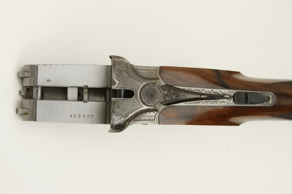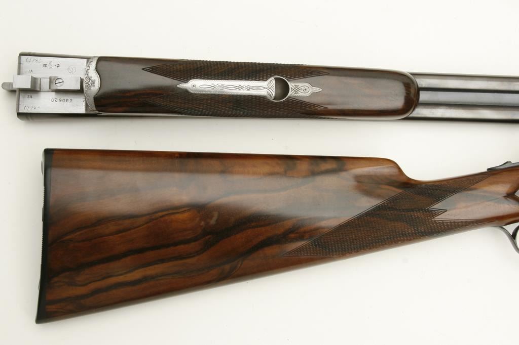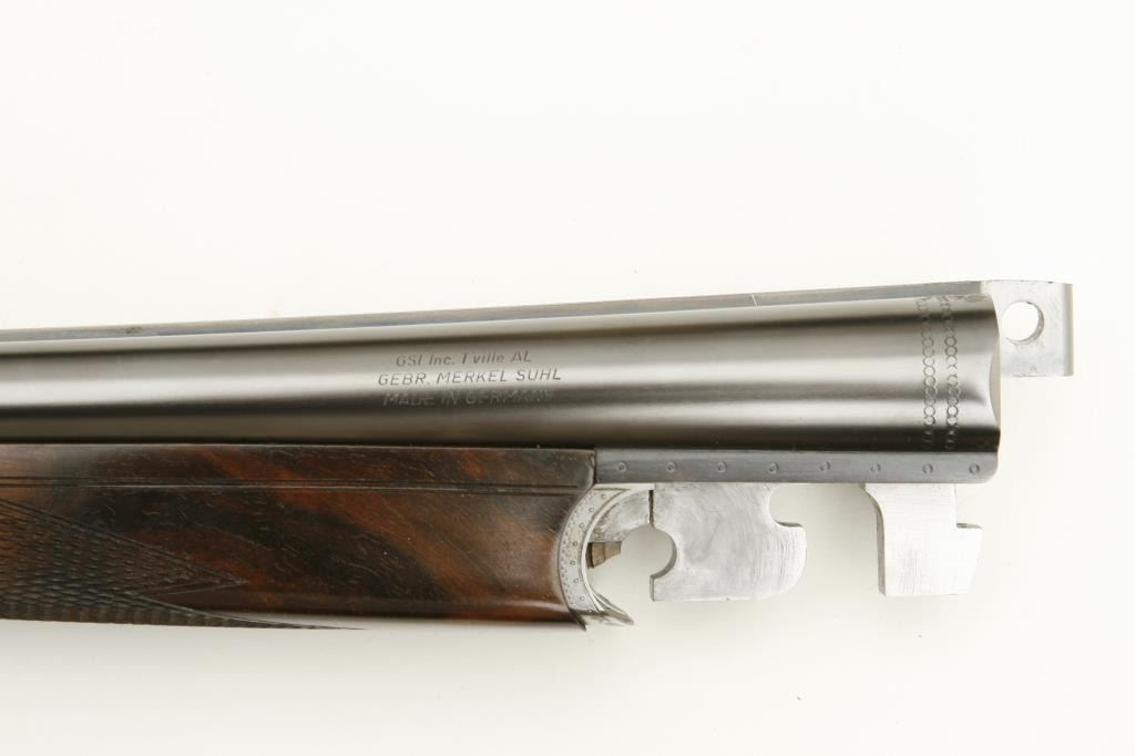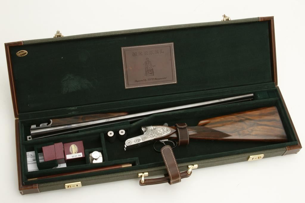 Merkel High Grade SxS shotgun, 28 gauge, 26.75” barrels, blued finish to barrels, finely engraved and game panel scenes on bright finished receiver, side plates, double triggers, checkered deluxe grained woodstocks, L.O.P. from front trigger is 14.5 to end of Merkel plastic butt plate, S/N 480520, in overall like new condition and accompanied by a Merkel deluxe suitcase style hard case with snap caps, metal oiler bottle and wood cleaning rod. (Modern). Est.: $7,000-$14,000.