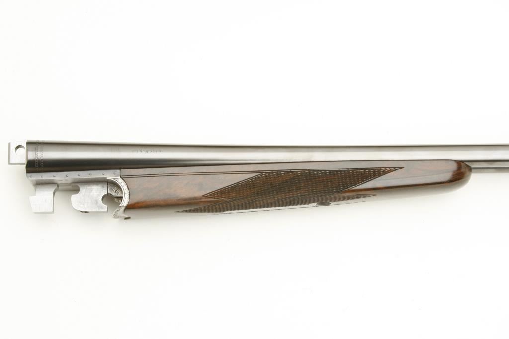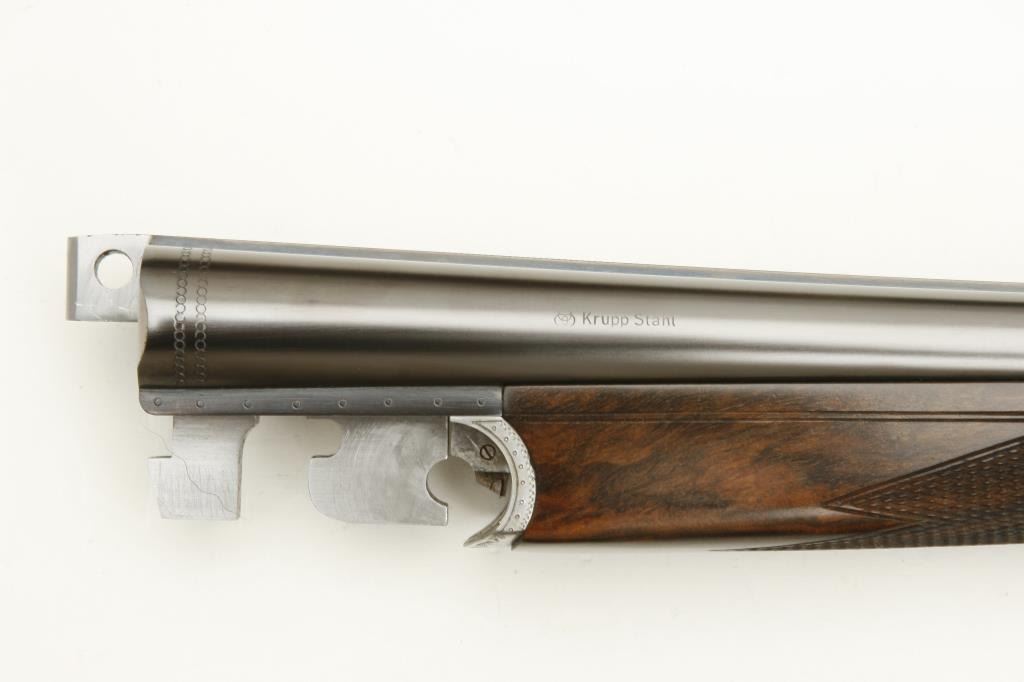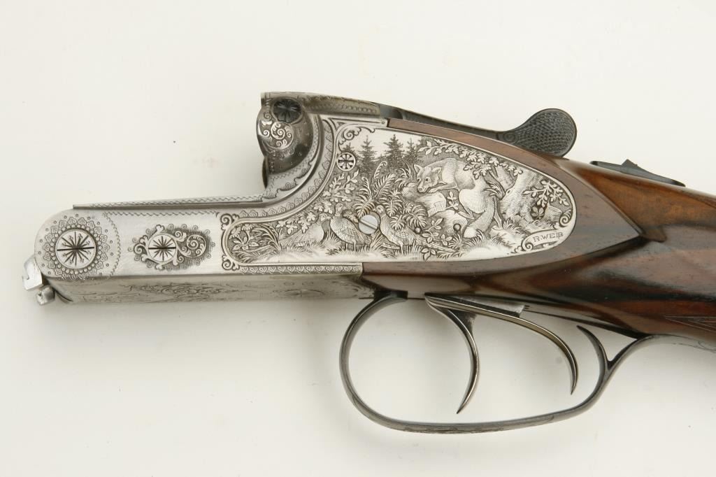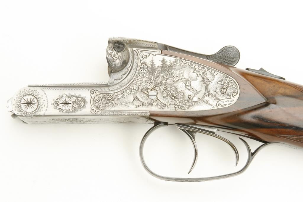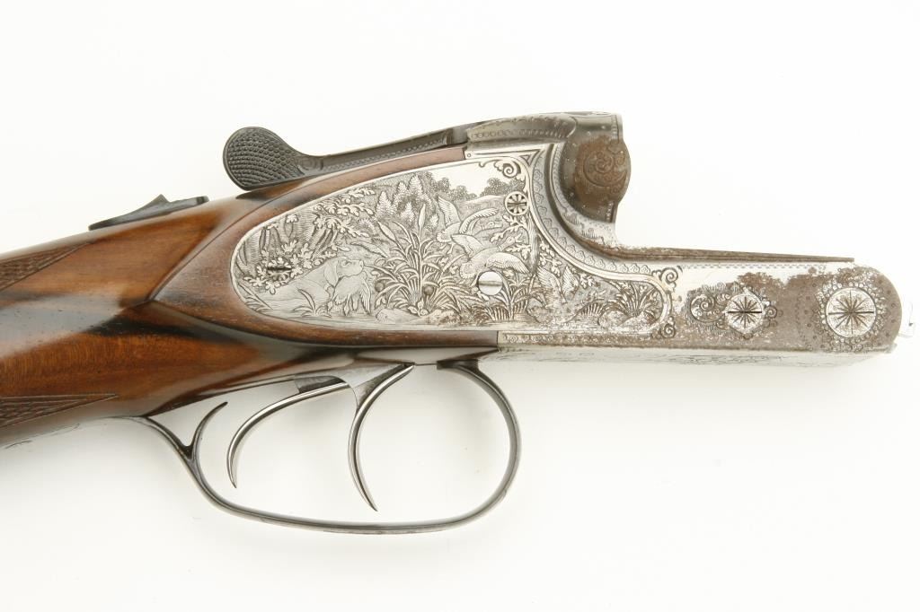 Merkel High Grade SxS shotgun, 28 gauge, 26.75” barrels, blued finish to barrels, finely engraved and game panel scenes on bright finished receiver, side plates, double triggers, checkered deluxe grained woodstocks, L.O.P. from front trigger is 14.5 to end of Merkel plastic butt plate, S/N 480520, in overall like new condition and accompanied by a Merkel deluxe suitcase style hard case with snap caps, metal oiler bottle and wood cleaning rod. (Modern). Est.: $7,000-$14,000.