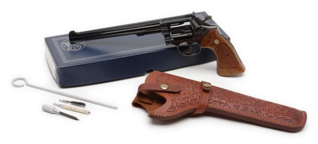 **Smith and Wesson Model 17-4 revolver, .22 Long Rifle caliber, with a 8 3/8” blued barrel, S/N 21K4771. The pistol is in excellent overall condition in the original blue box with factory packing material,cleaning rod and screwdriver. The pistol retains nearly all of its blued finish with a pinned barrel with full length matte rib. The checkered wood medallion grips are in excellent condition as well showing little to no use. The hammer and trigger display significant case color. The action is crisp, markings sharp and bore excellent on this nice S&W pistol. The pistol comes with a nice tooled leather holster marked “BrauerSt. Louis, Mo”. Est.: $350-$700.