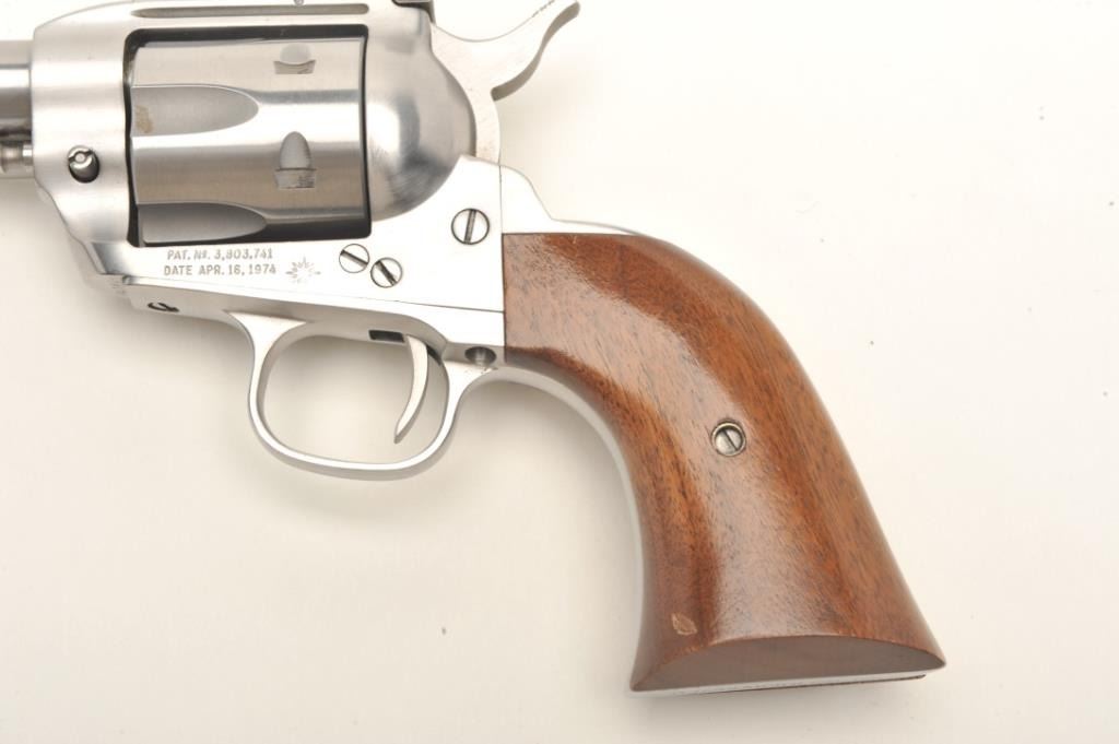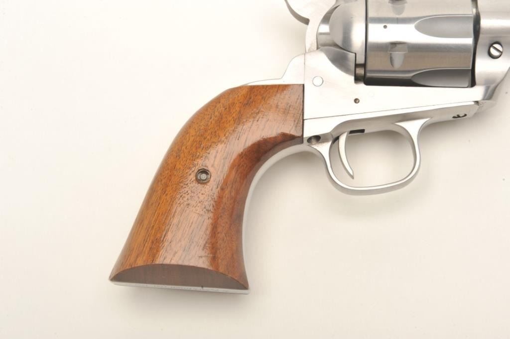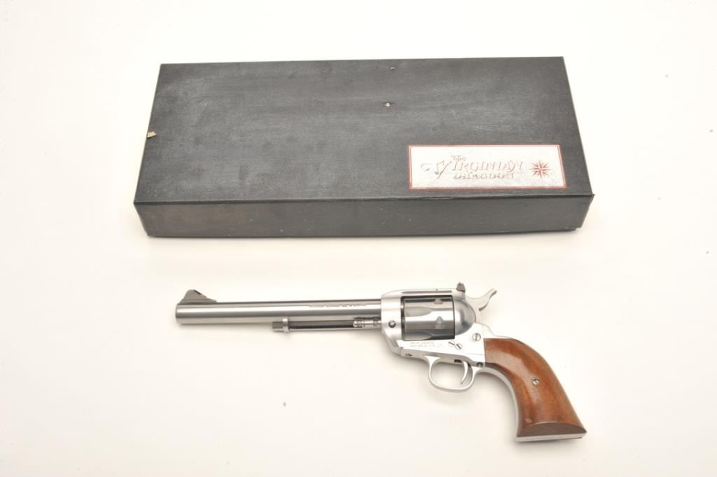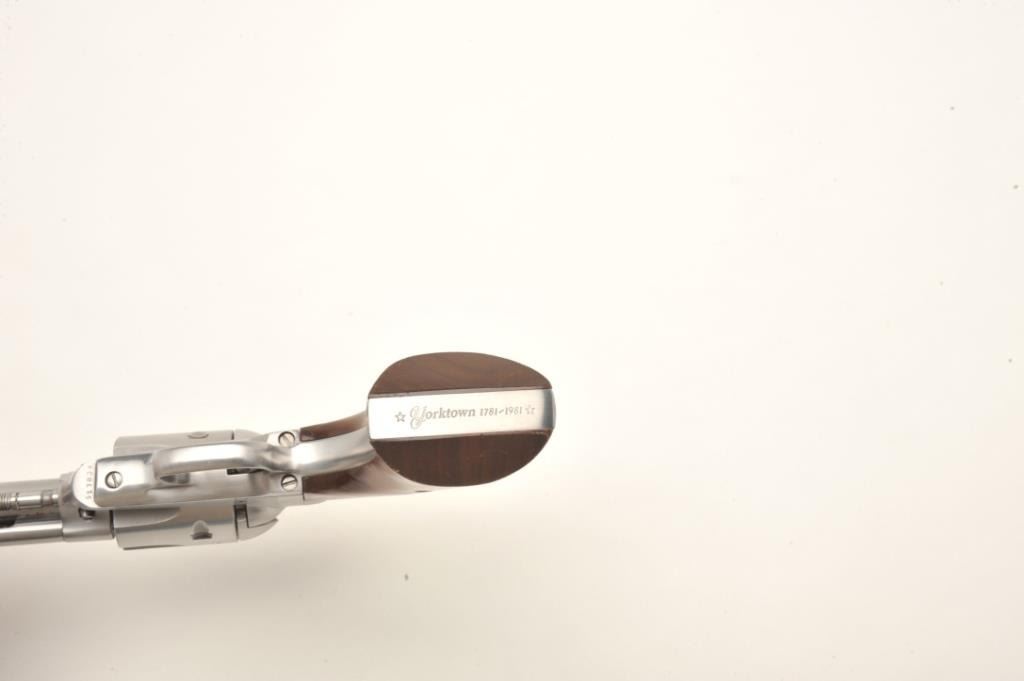 Interarms Virginian Dragoon revolver, .44 Rem. Magnum caliber, serial #S17834. The pistol is as new in the box. The pistol features an 8 ¼” barrel with a ramp front and adjustable rear sights. The pistol isfinished in brushed stainless and shows only light handling marks. The cylinder has only a faint drag line. The smooth wood grips are in very good condition with one small dent on the left grip. The bottom of the grip isinscribed, “Yorktown 1781-1981”. The bore is excellent, the action crisp and markings sharp. The pistol comes in the original box. Est.: $250-$500. (Modern).