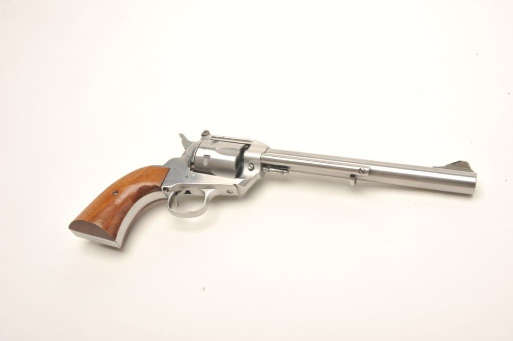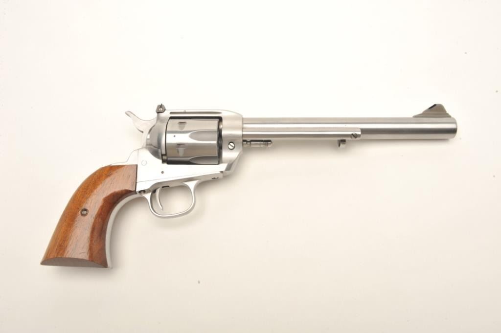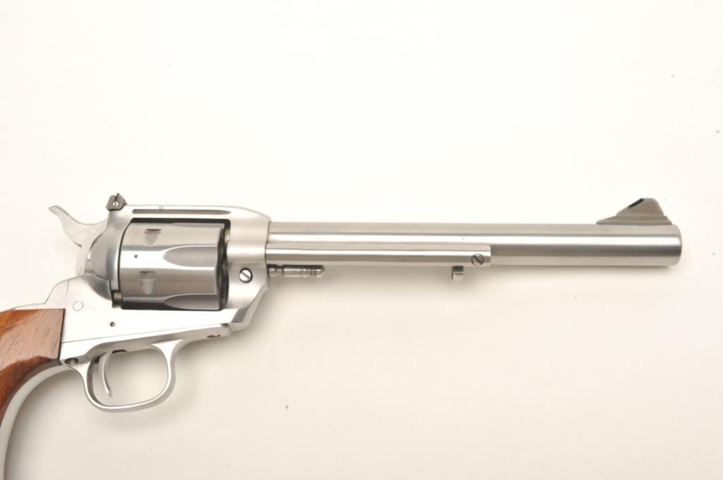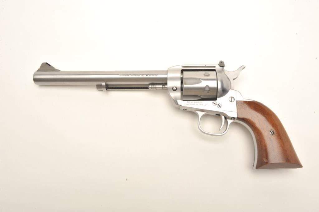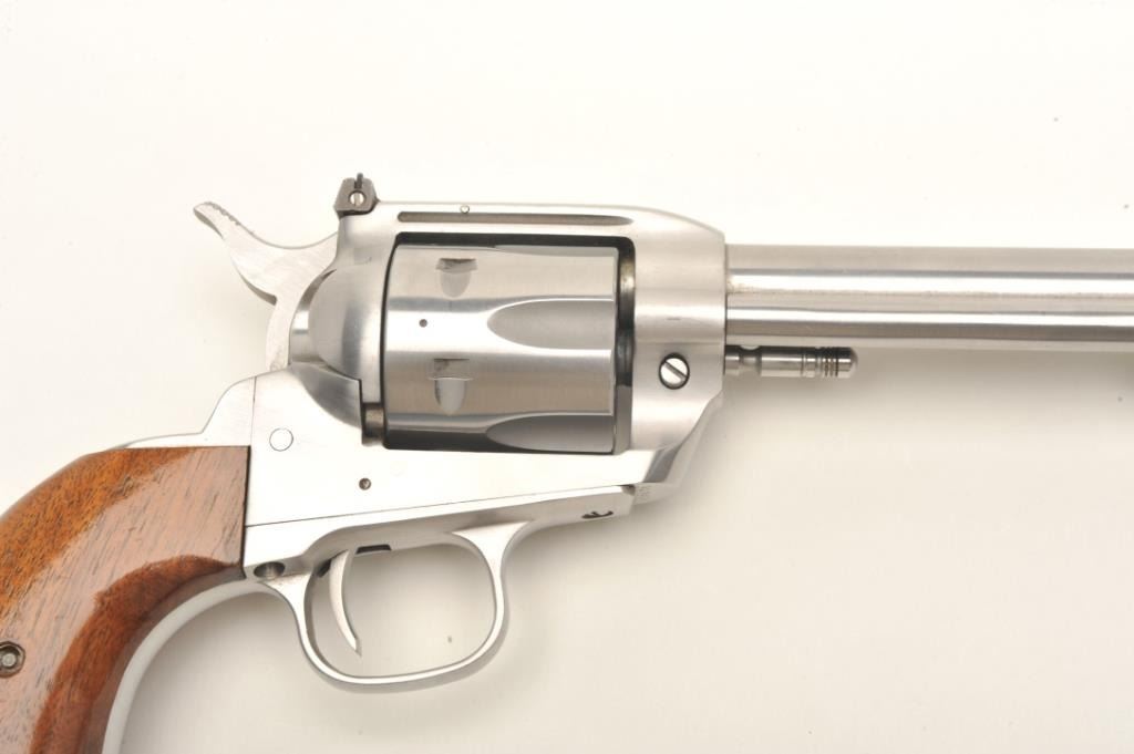 Interarms Virginian Dragoon revolver, .44 Rem. Magnum caliber, serial #S17834. The pistol is as new in the box. The pistol features an 8 ¼” barrel with a ramp front and adjustable rear sights. The pistol isfinished in brushed stainless and shows only light handling marks. The cylinder has only a faint drag line. The smooth wood grips are in very good condition with one small dent on the left grip. The bottom of the grip isinscribed, “Yorktown 1781-1981”. The bore is excellent, the action crisp and markings sharp. The pistol comes in the original box. Est.: $250-$500. (Modern).