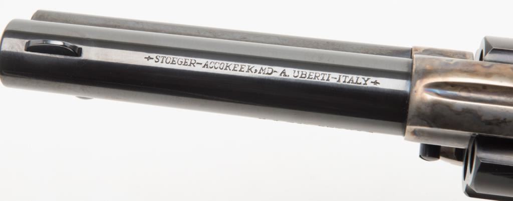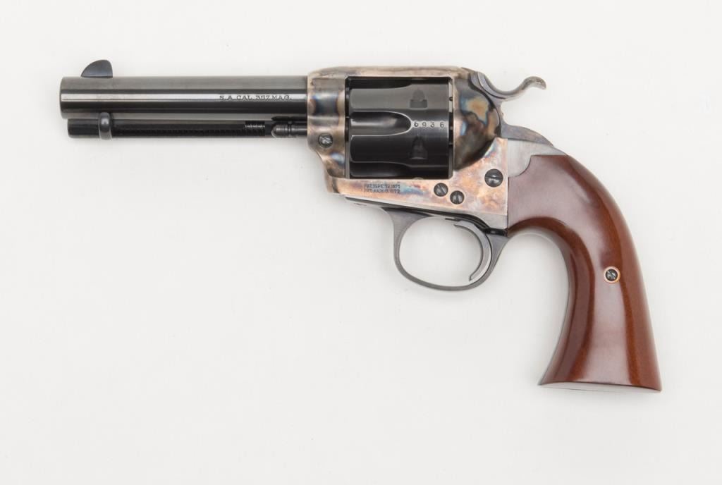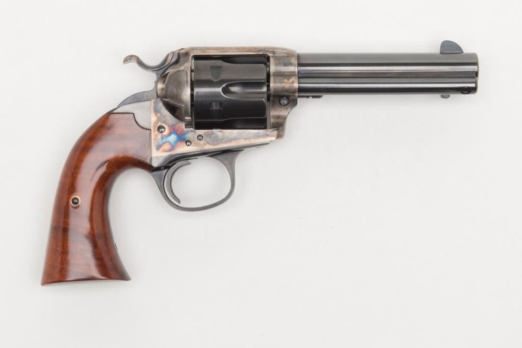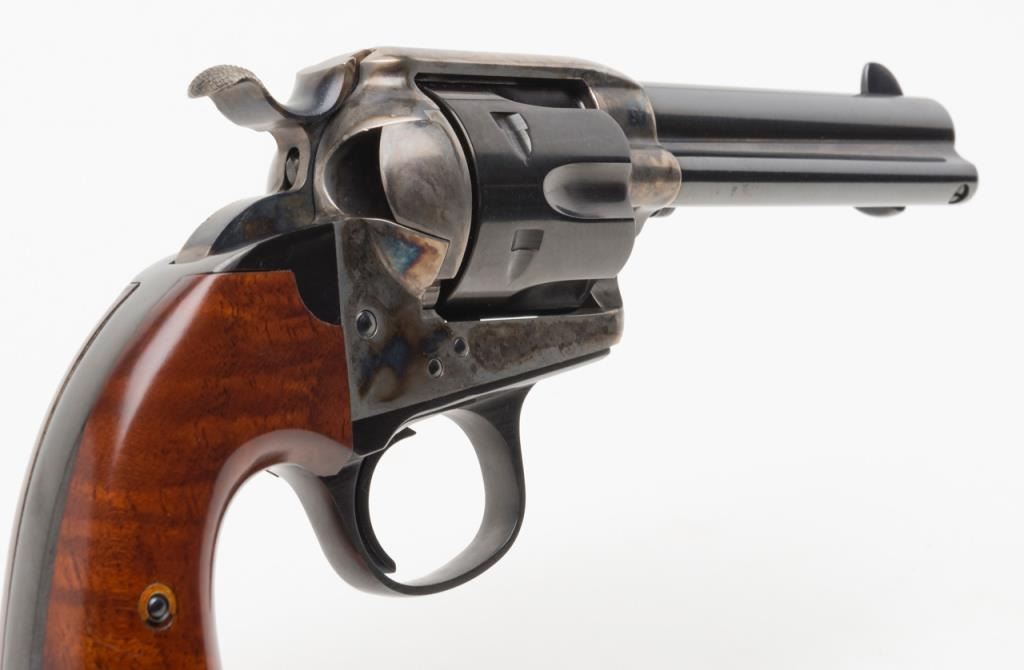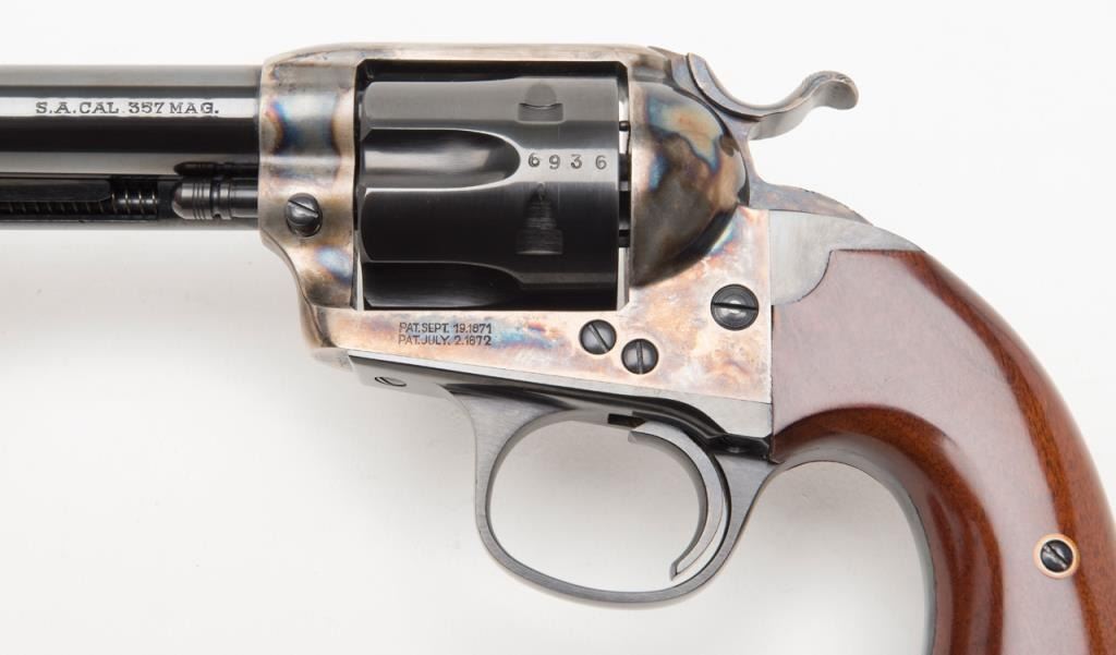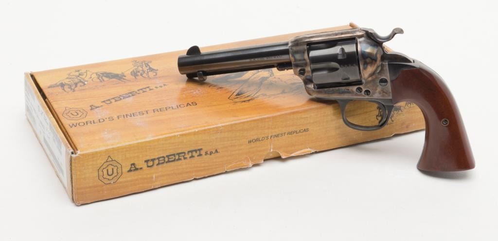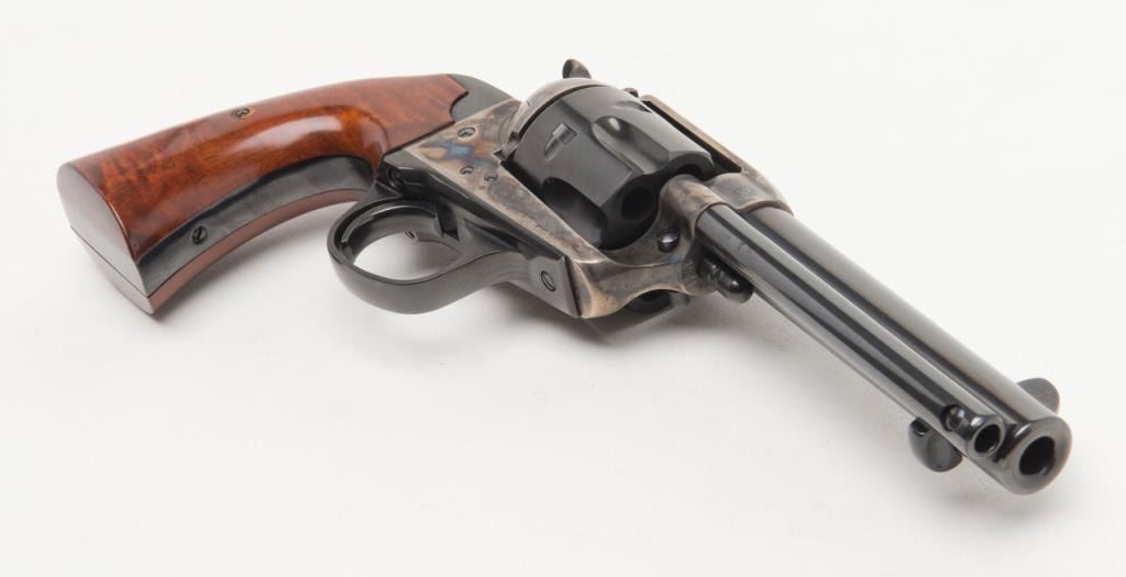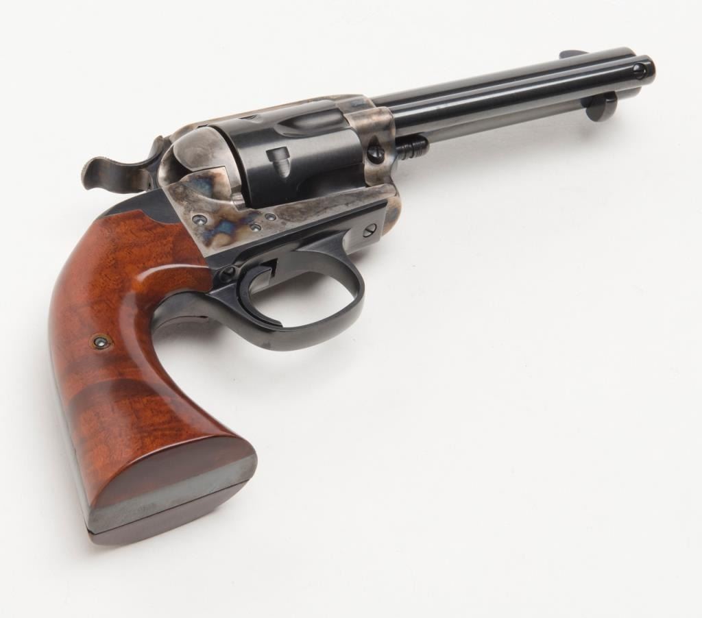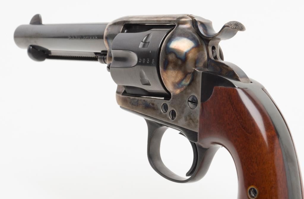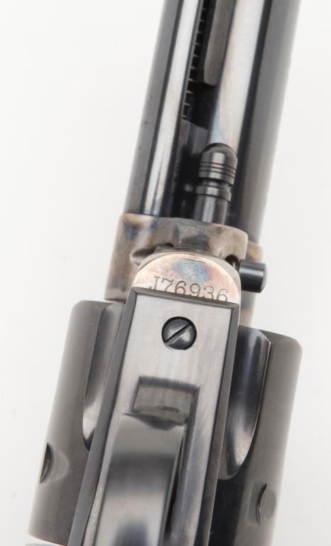 Uberti Cattleman Bisley revolver, cal. .357 Magnum, Serial #J76936. The revolver is as new in the box with a 4 3/4” barrel. Finished in blue and case color, the pistol appears to be unfired. The smooth wood grips demonstrate nice fit and finish. A great gun for the cowboy action shooters. (Modern). Est.: $350-$700.
