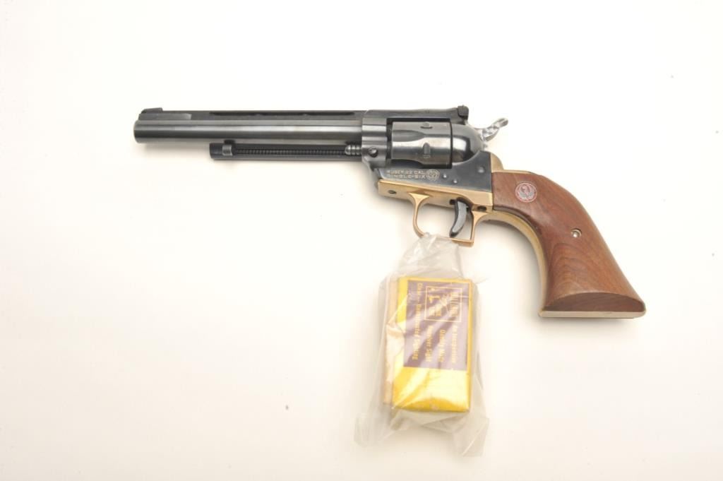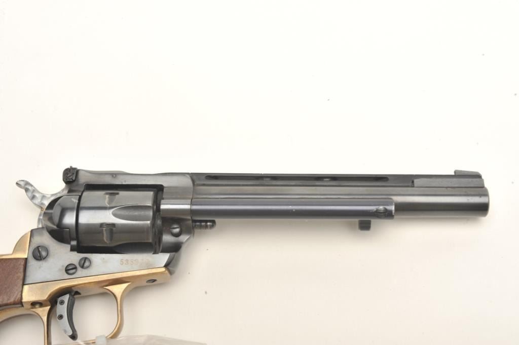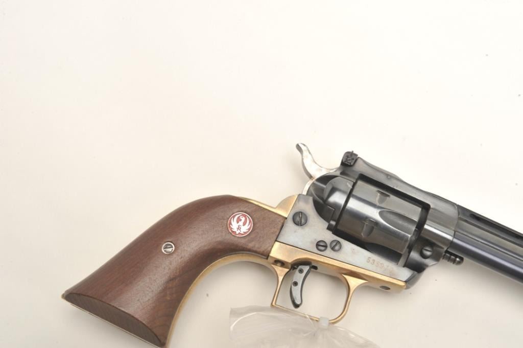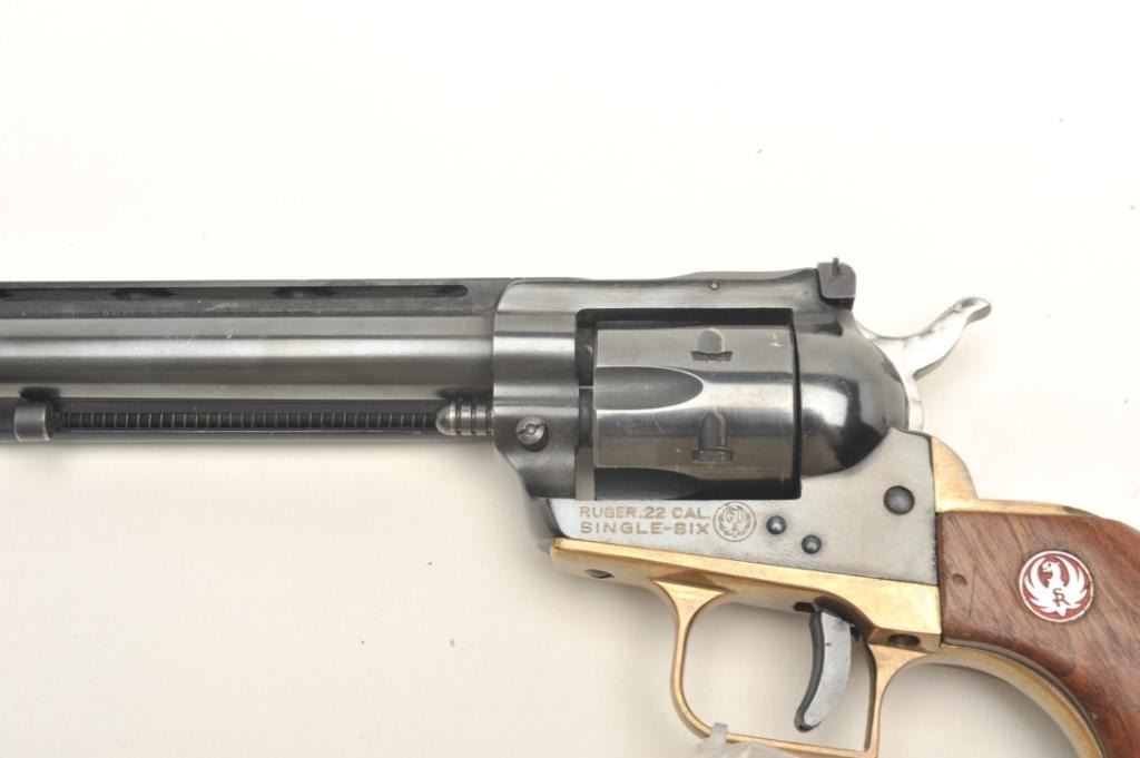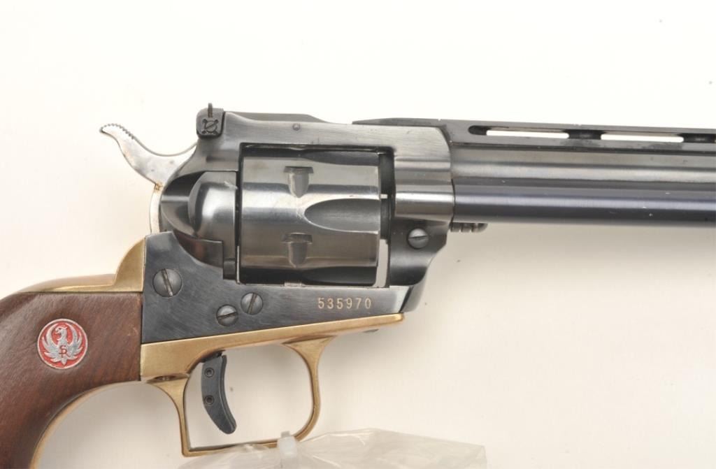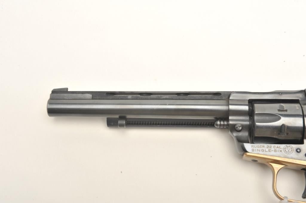 Ruger Single Six revolver, .22 caliber, serial #535970. The pistol is in very good overall condition as customized. The pistol sports a 6 ¼” barrel with a full-length a ventilated rib. The barrel and action retain the majority of their blued finish. The hammer has been engine turned. Additionally, the brass trigger guard and back strap from a reproduction Navy revolver have been added. The smooth wood medallion grips are in very good condition showing only handling marks. The lot includes an extra cylinder. This is an unusual custom Ruger with an interesting look to it. Est.: $200-$400. (Modern).