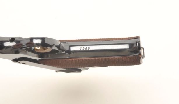 Colt Pre-Woodsman semi-auto pistol, .22 Long Rifle caliber, serial #7989. The pistol is in very good overall condition with a 6 5/8” barrel. The pistol retains the majority of its polished blue finish with a beautifulRampant Colt emblem at the rear of the slide. The checkered wood grips are in very good condition as well showing only minor handling and storage marks. There is a small area of rust at the base of the magazine. The boreis very good, the action crisp and markings are sharp on this desirable pre-Woodsman Colt. Est.: $700-$1,400. (C+R).