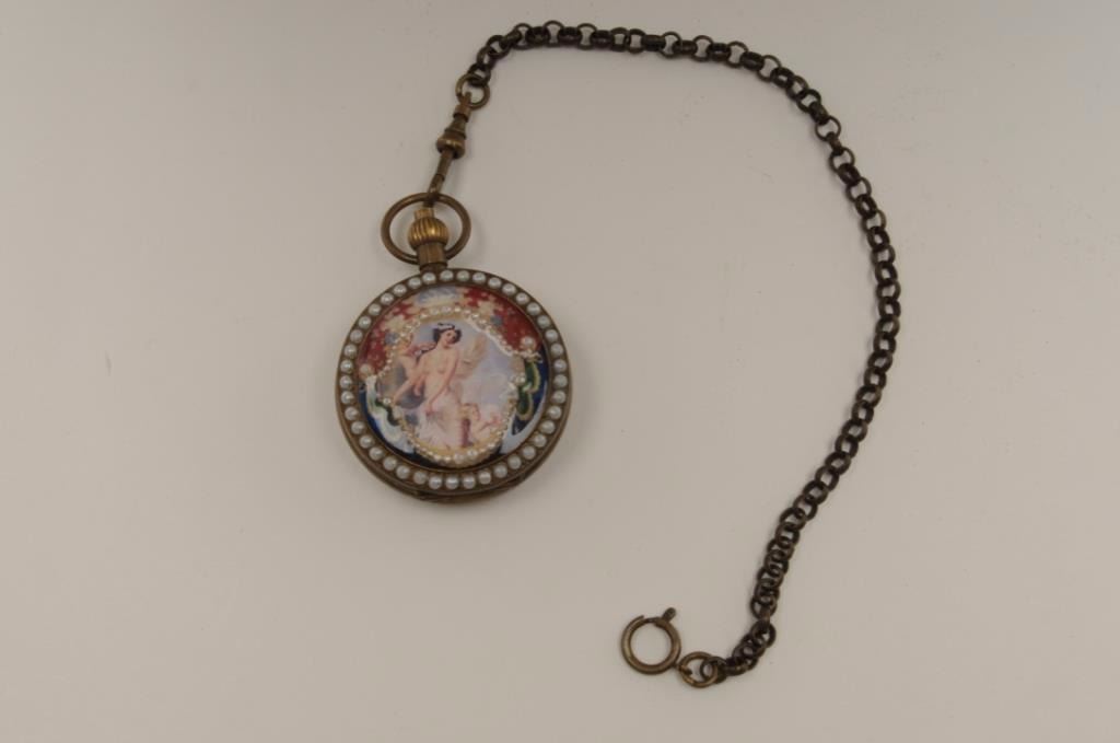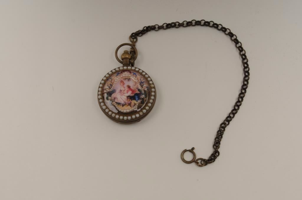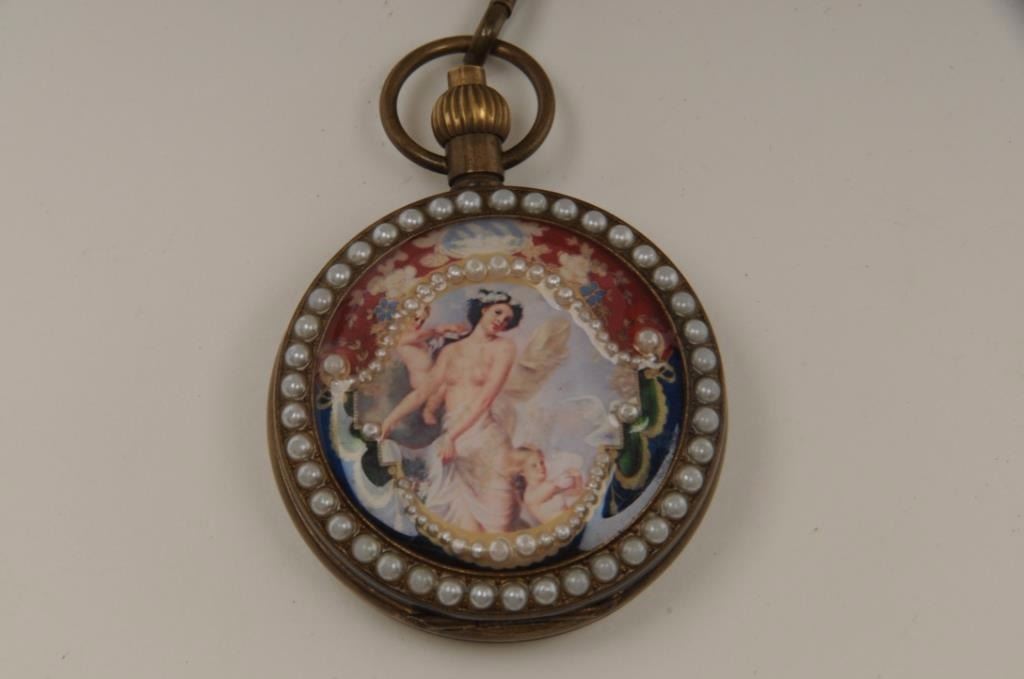 Brass cased fancy pocket watch with two sided color designs of a woman on one side and a man and woman on the other, surrounded by small pearls; working at time of description. Est.: $75-$125.