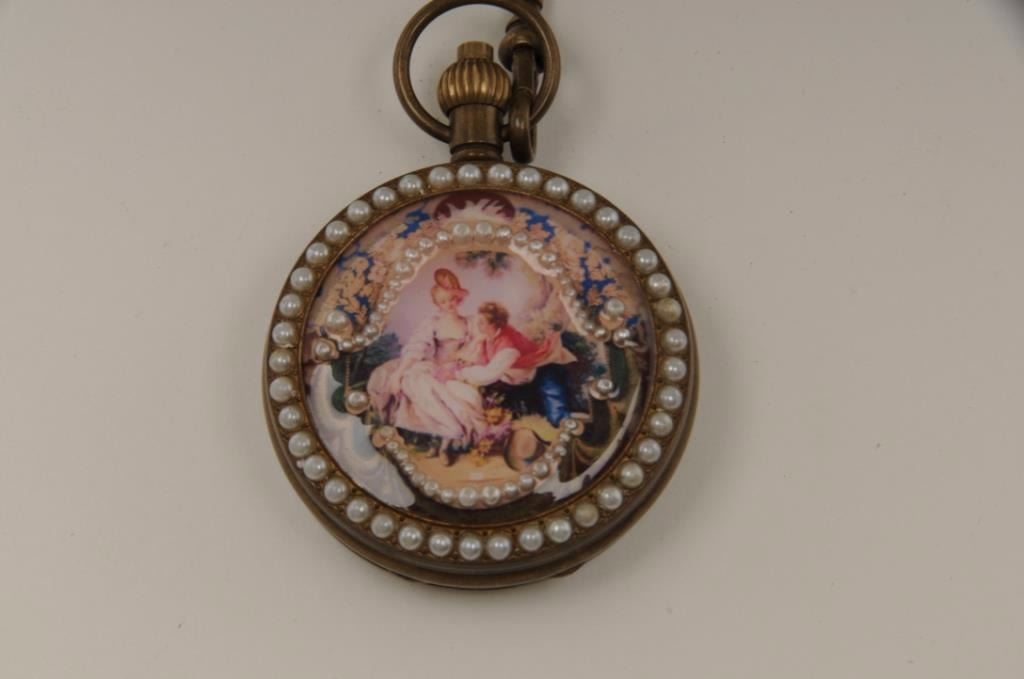 Lot 906 Brass cased fancy pocket watch with two sided color designs of a woman on one side and a man and w