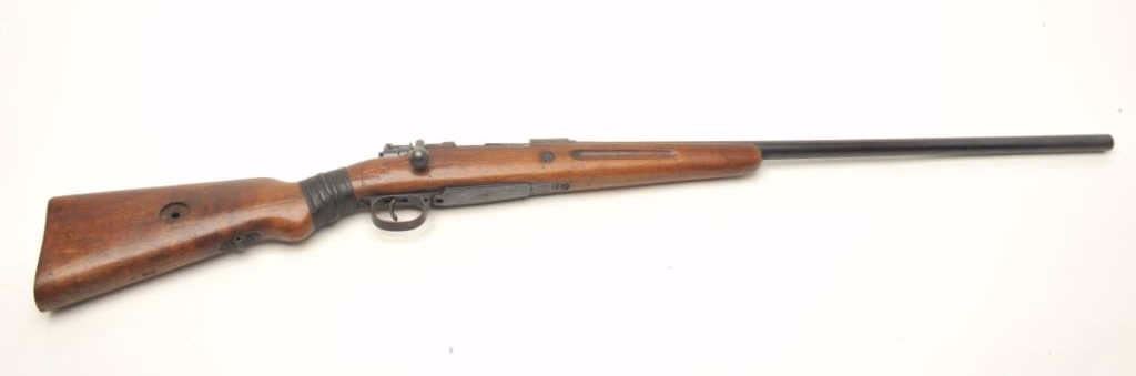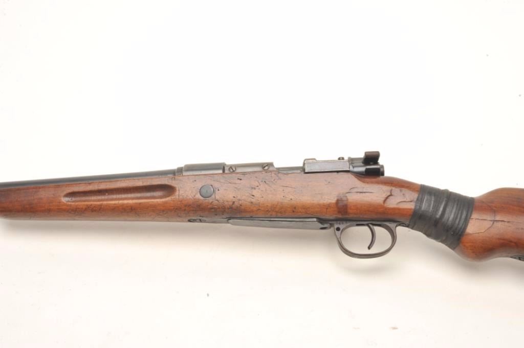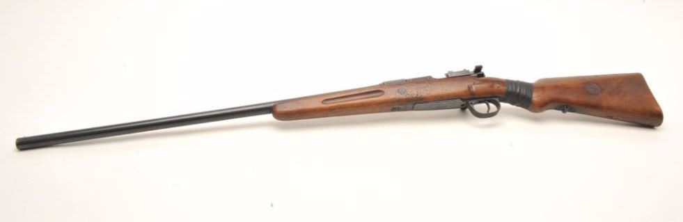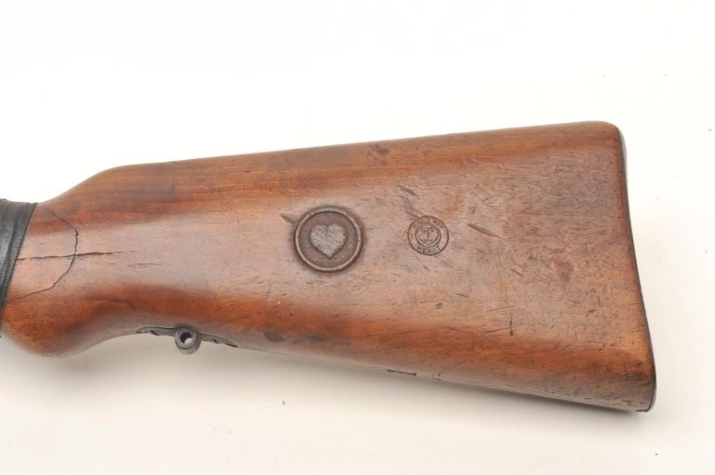 Mauser bolt action shotgun, approximately 12 gauge, serial #NSNV. The shotgun is in good overall condition with a 27” barrel with a steel bead front sight. The barrel and receiver retain the majority of their bluedfinish. The barrel is marked, “Nitro” and front ring, “GERMANY”. The smooth wood stock is in fair condition. It has been broken at the wrist and repaired with old cloth tape. The butt stock features several cartouches,the most interesting is, “HARD HIT HEART” with a heart in a circle on the left side of the butt. The rifle ends with a smooth metal butt plate. The bore is good, the action functions and the markings are legible. Anodd shotgun built on what appears to be an old 98 Mauser action. $200-$400. (C+R).