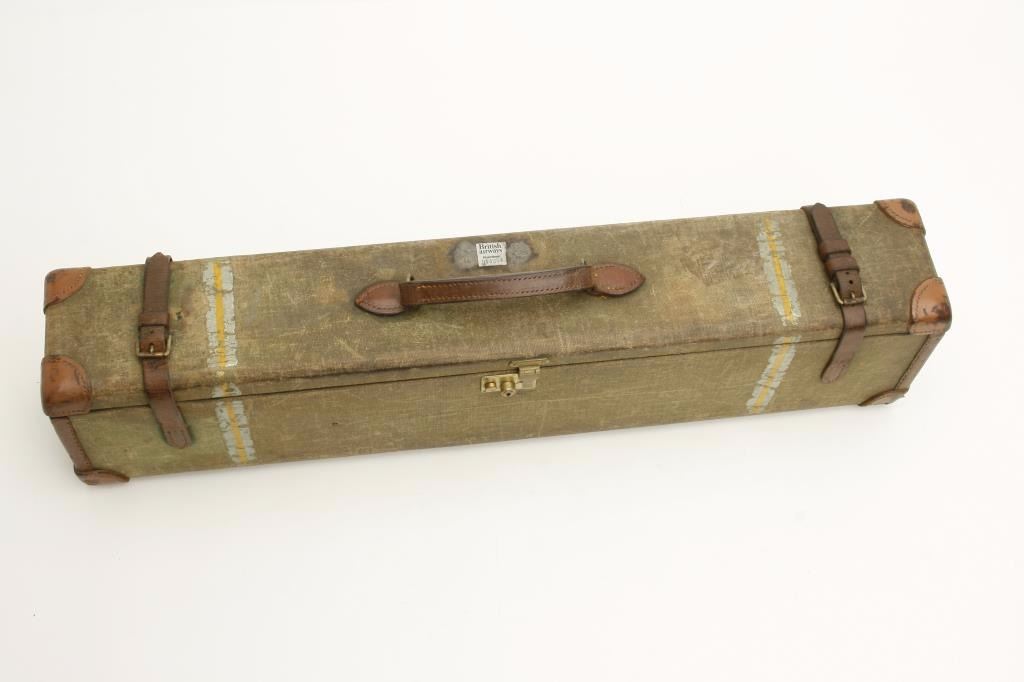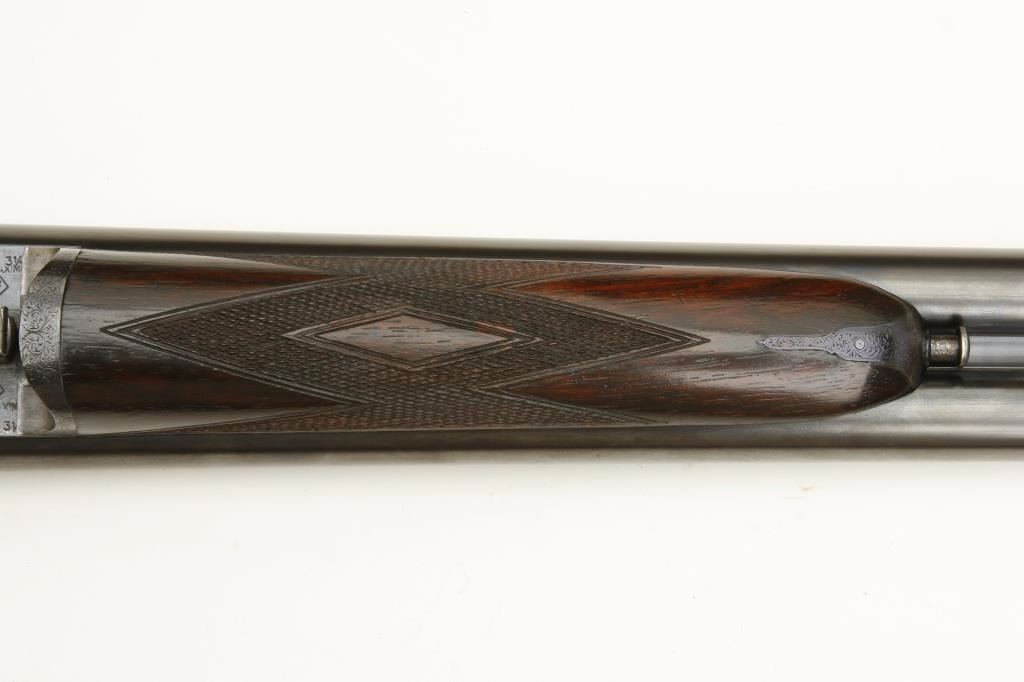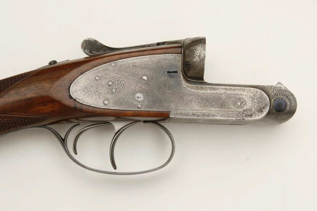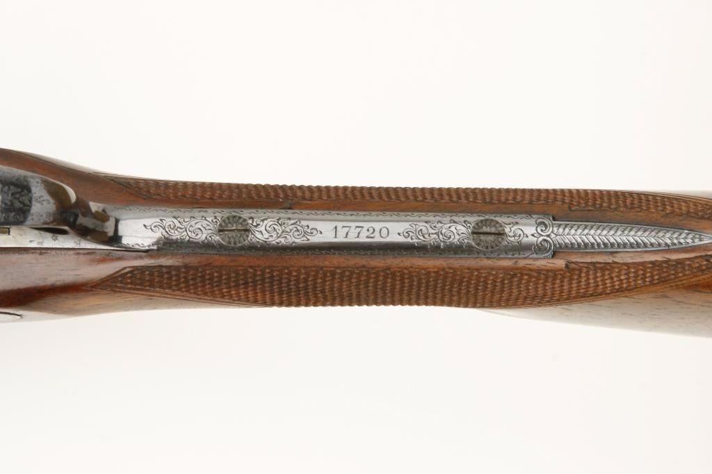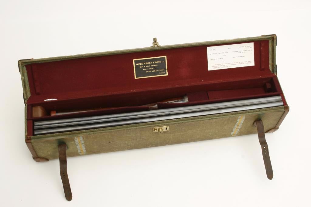 James Purdey & Sons 12 bore SxS shotgun with 30” barrels, auto ejectors, 2 ¾” chambers, S/N 17720 and originally built 1902-05. Copies of letters and bills from Purdey confirms return to the factory forrefinishing, lengthening of chamber, and re-proof circa 1978. Currently shows 1978 nitro proof for 1 1/8 oz. shot also self-opening, straight stock without pistol grip, splinter fore end, floral and scrollbest quality engraved with British style heel plate. Letters also confirm restocking and change from pistol grip to straight. The condition is fine to excellent as factory re-built and refinished. The length of pullis 14 ½” to front trigger, drop is 1 ½” at comb and 2 ½” at heel. Choked cylinder and improved cylinder. The barrel thickness are “In range”. Also a Purdey motor case with label in lid included. Approximately $80,000to replace at current rates and a very nice gun showing modern proofing and factory restoration. (C&R) Est.: $12,500-$25,000