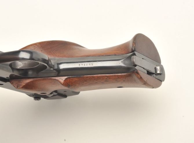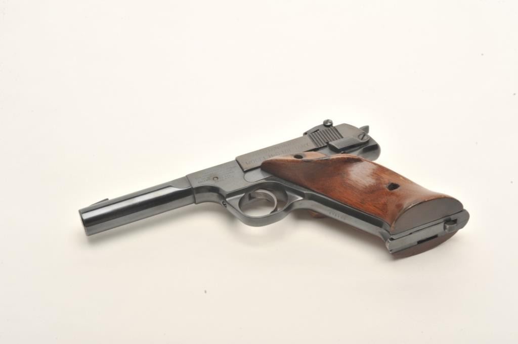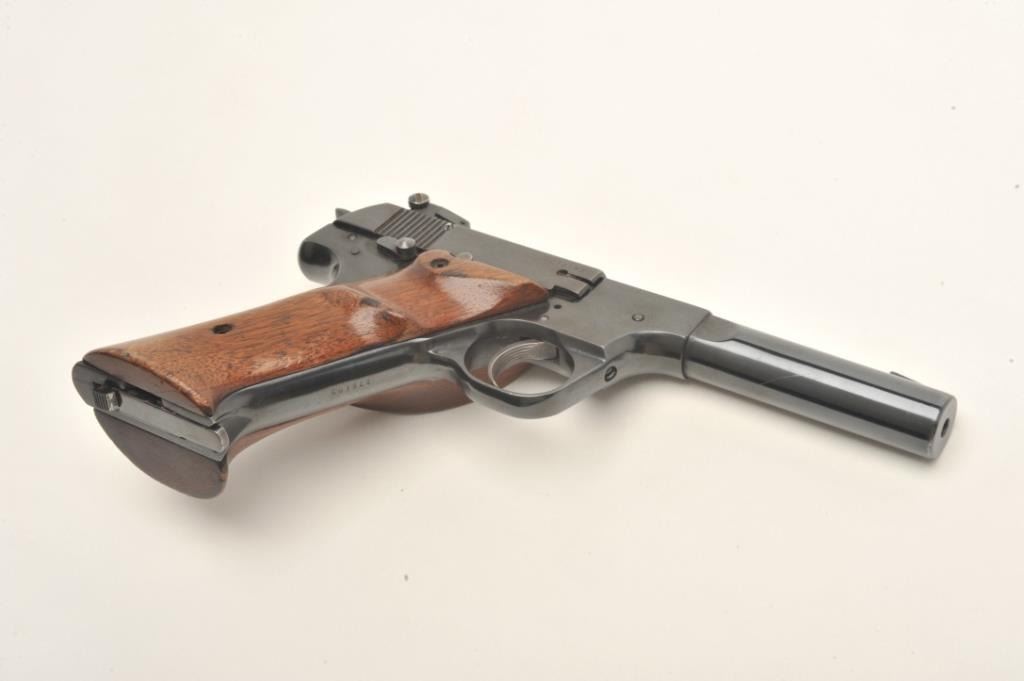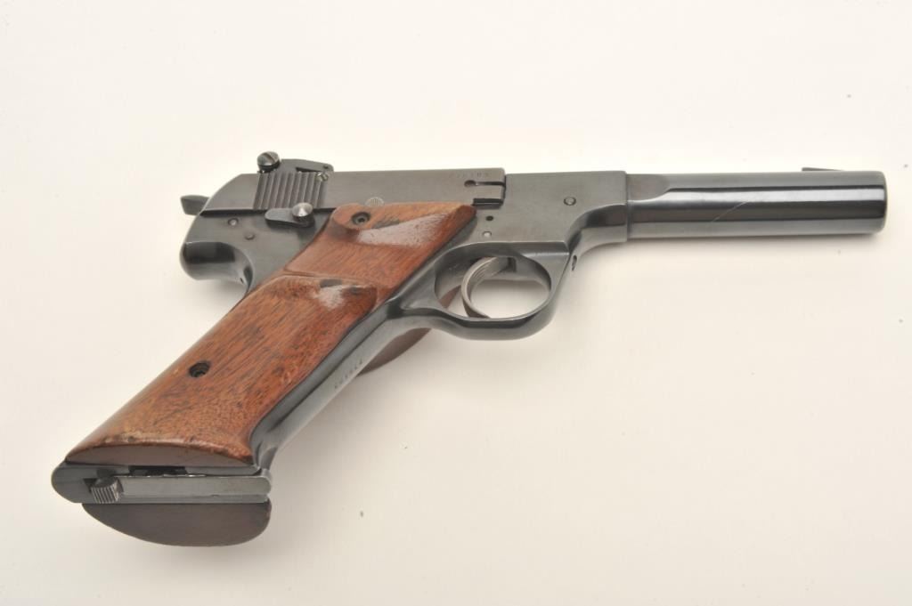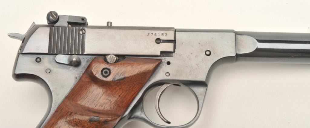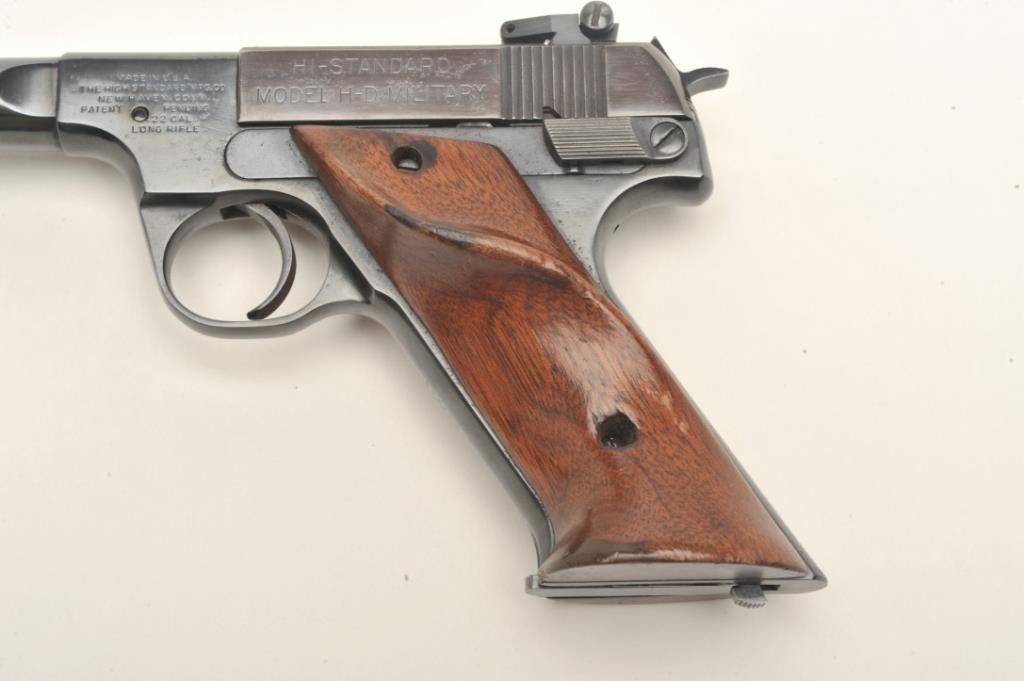 High Standard Model H-D Military semi-auto pistol, .22 LR caliber, serial #276183. The pistol is in very good to nearly fine overall condition with a 4 ½” barrel. The pistol features a ramp front and adjustable rearsights. The pistol retains nearly all of its blued finish with high point edge and muzzle wear. The smooth, oversize target grips are in good condition with small mars and loss of finish. The pistol comes with one correct magazine. The bore is good, the action crisp and markings are sharp on this desirable High Standard. Est.: $250-$500. (C+R).