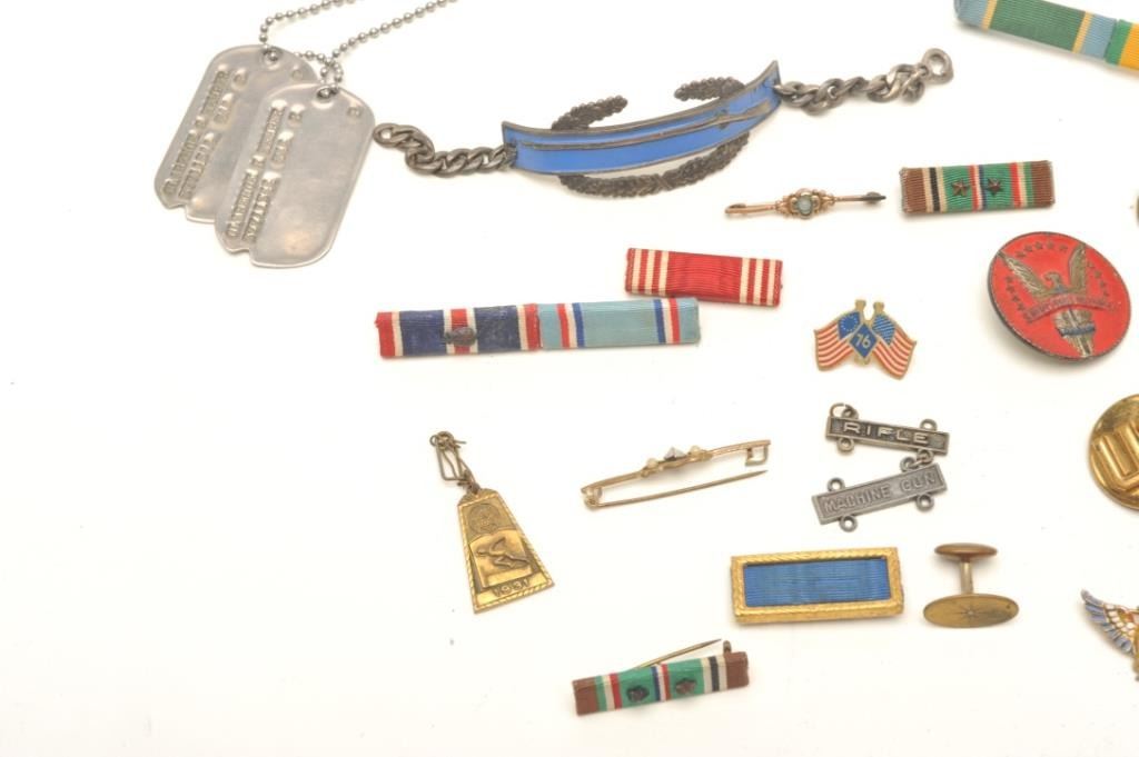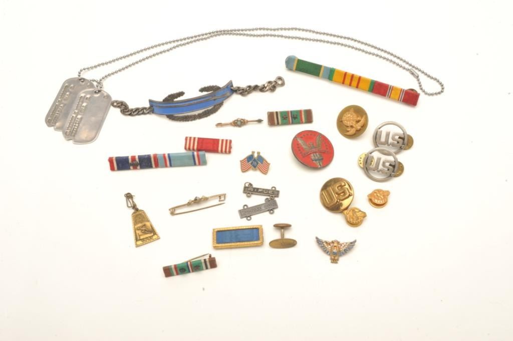 Lot of approximately 22 misc. U.S. military pins, buttons, ribbons, etc. and a pair of G.I. dog tags. Est.: $50-$75.
