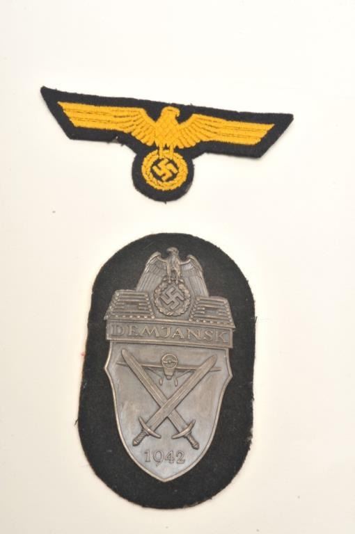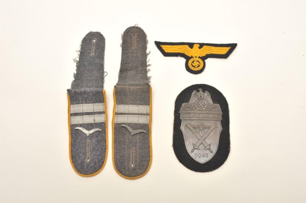 A lot of 2 German style uniform shoulder boards, a German style nazi patch and a German style medal marked “DEMJANSK/1942”. Est.: $100-$150.