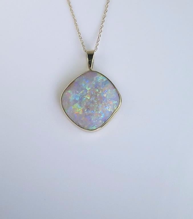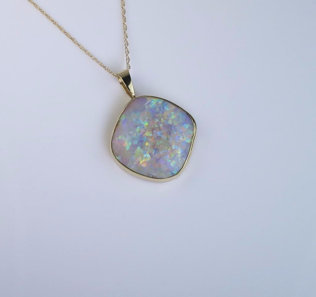 Exciting Fine Australian Opal with amazing full range color play weighing approx. 6.00 -8.00 carats set in 14 karat yellow gold. Retail $2,000-$3,000 Estimates $1,200-$1,800