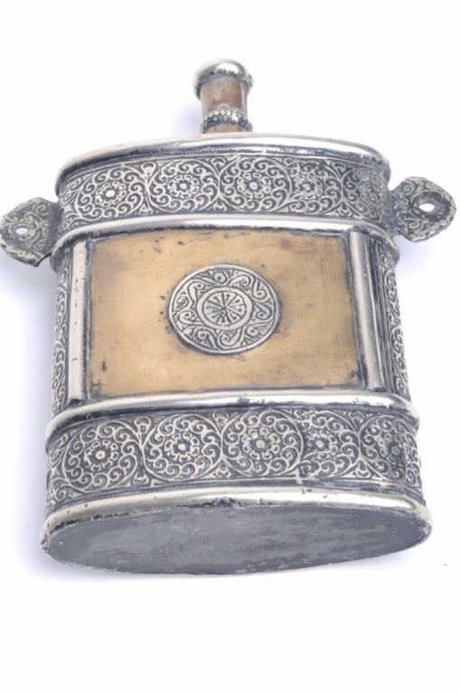 Lot 985 19th century Mid-Eastern powder flask with silver overlay on the brass body and ornate engraving.