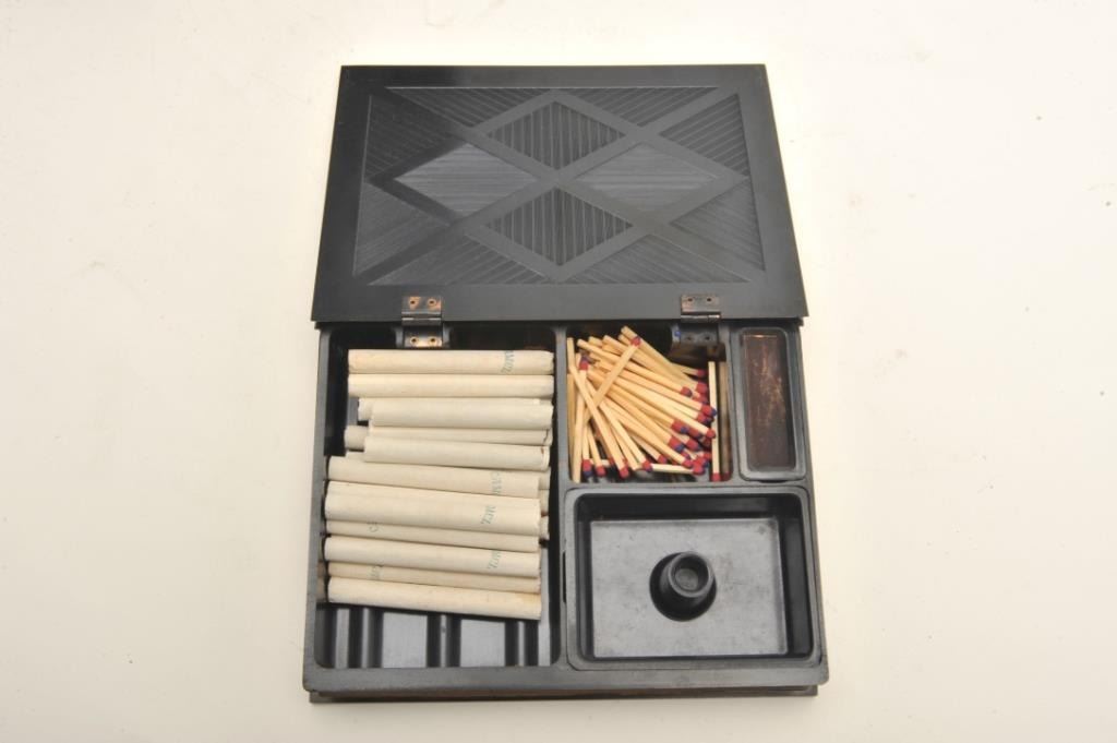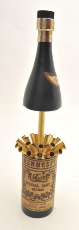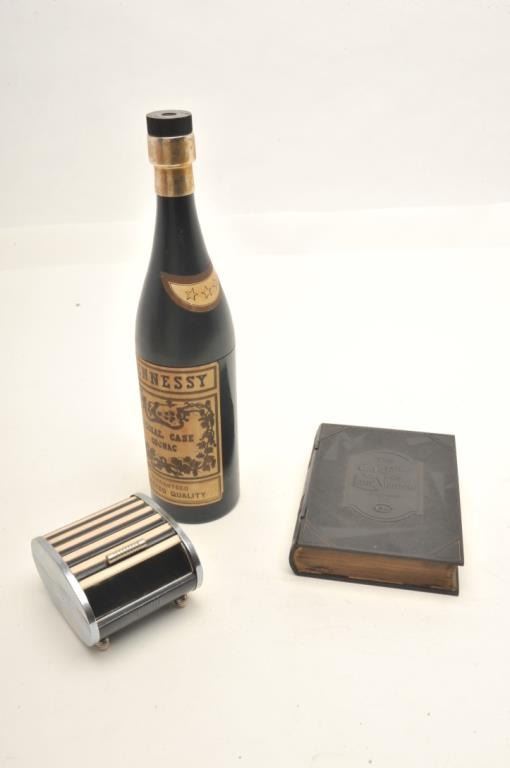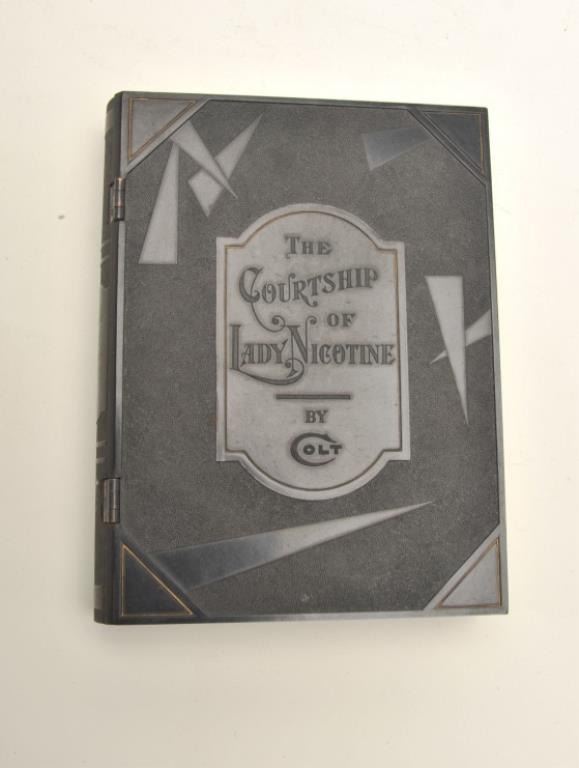 Lot of vintage table lighters and misc. tobacco accessories by makers like Evans, Swank, Ronson, Rowenta, etc. including a metal Hennessy cognac bottle table lighter/cigarette dispenser with bottlepulling apart for cigarettes, when opened it plays music (working at time of description); also a brass and painted table lighter with move3able hands on the face of the clock ande changeable message (ca. 1930’s); plus a very desirable gutta percha type early book style smoking accessory that when opened has compartments for cigarettes, matches, a striker and an ashtray with the title of the “book” noted as “The Courtship of LadyNicotine” manufactured by the Colt Firearms Co. (ca. early 1900’s). (Reference: James Flanagan’s definitive work “The Big Book of Cigarette Lighters”). Est.: $450-$600.
