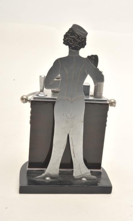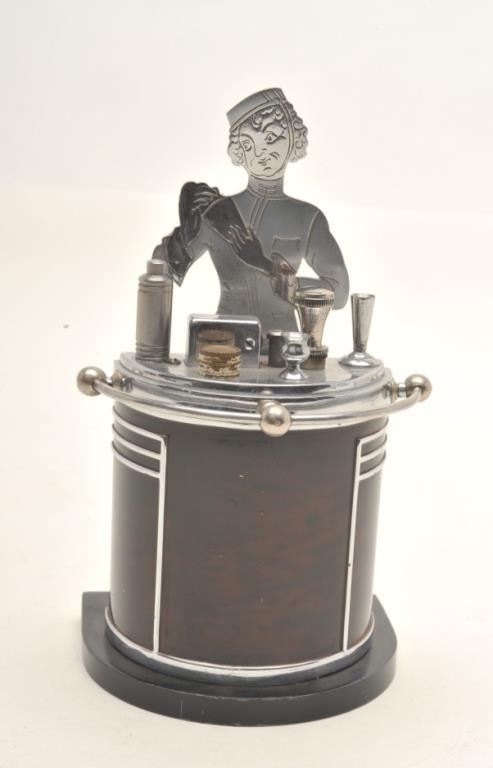 Scarce and highly collectible Junior Bartender touch tip table lighter in chromium and walnut enamel by Ronson (ca. 1937) approximately 7.5” in height and 4.25” in width; very good to fine condition.(Reference: James Flanagan’s definitive work “The Big Book of Cigarette Lighters”). Est.: $500-$750.