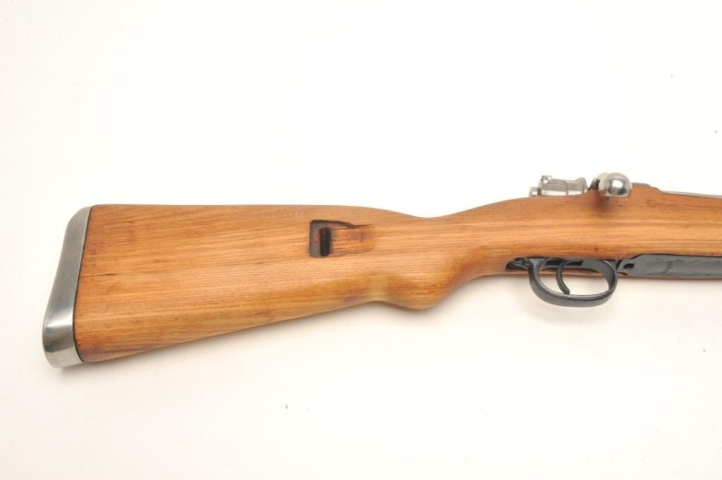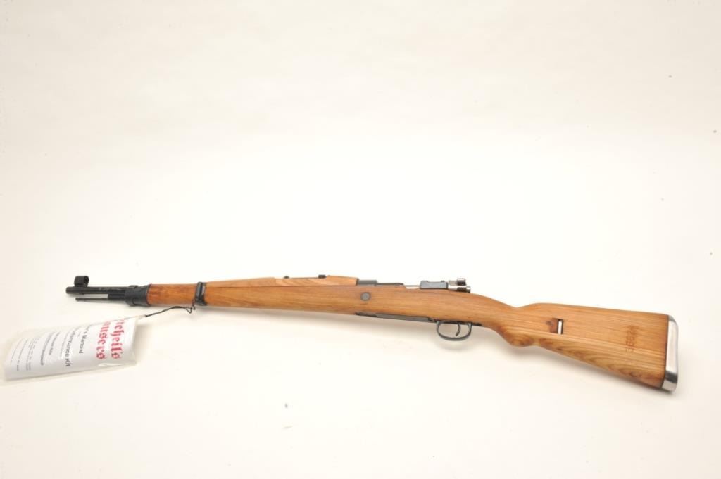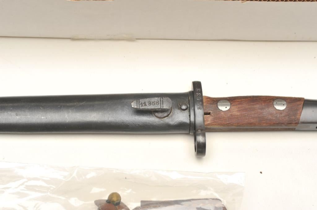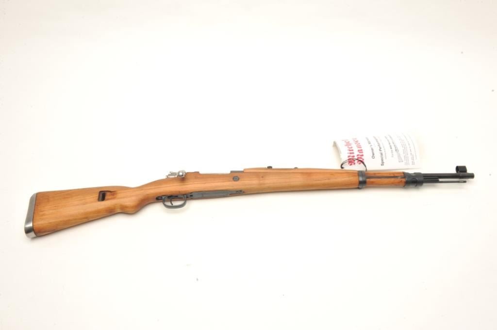 Mauser Model 48A bolt action rifle, 24” import-marked barrel , blued finish, wood stock, S/N 36624, in “Mitchell’s Mausers”-marked cardboard box with accessories including a bayonet, scabbard,leather frog, rifle sling, ammo pouch and field cleaning kit. This gun is in overall very good condition with a very good bore, crisp action and markings, very good stock. Instructions also included. (C&R).Est.: $400-$500.