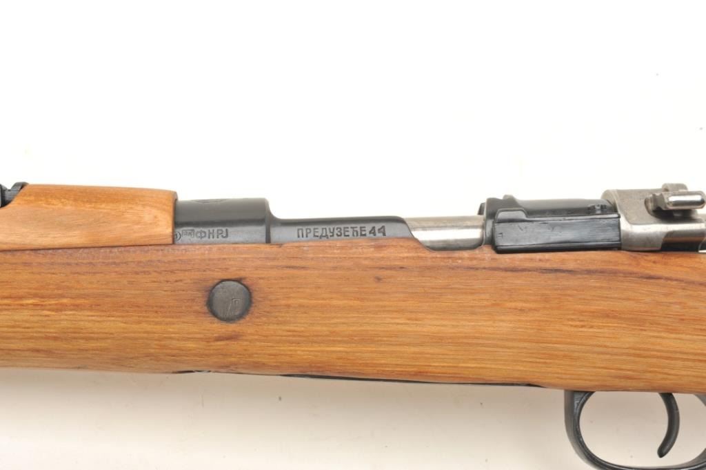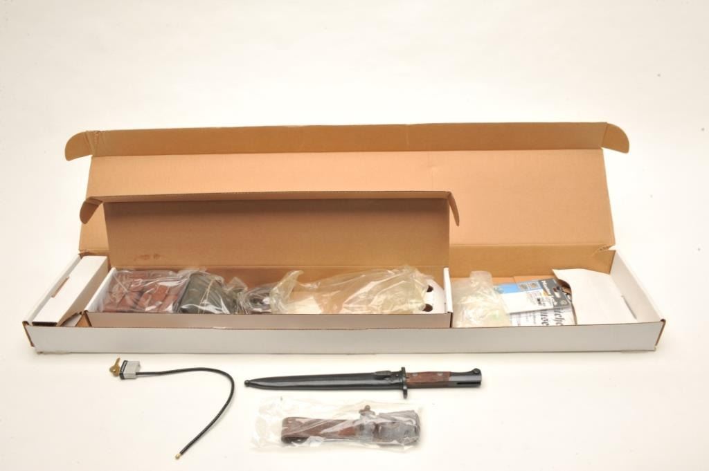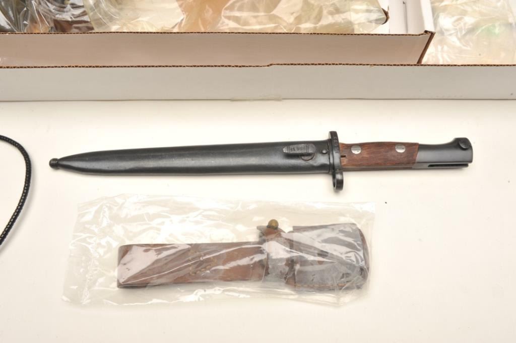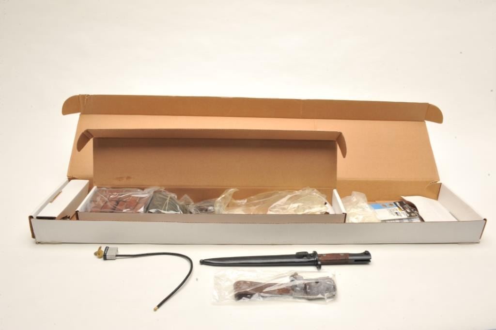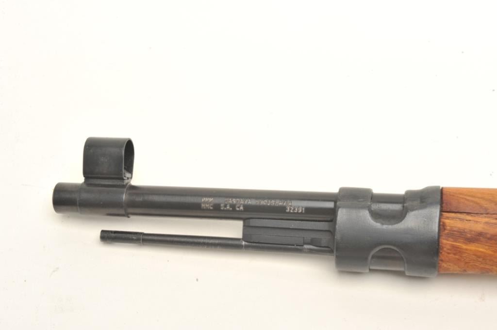 Mauser Model 48A bolt action rifle, 24” import-marked barrel , blued finish, wood stock, S/N 36624, in “Mitchell’s Mausers”-marked cardboard box with accessories including a bayonet, scabbard,leather frog, rifle sling, ammo pouch and field cleaning kit. This gun is in overall very good condition with a very good bore, crisp action and markings, very good stock. Instructions also included. (C&R).Est.: $400-$500.