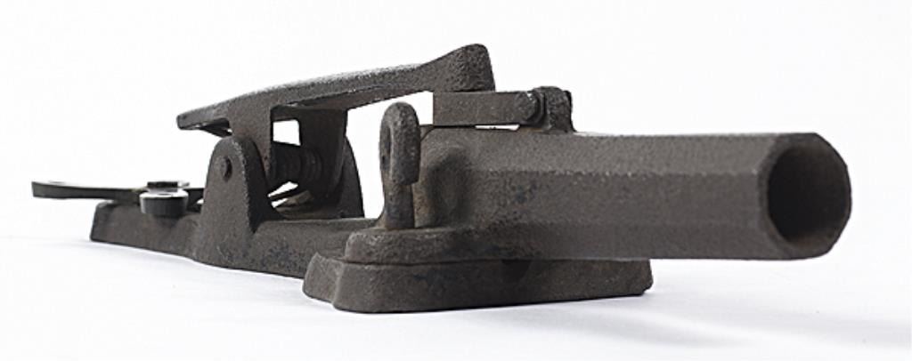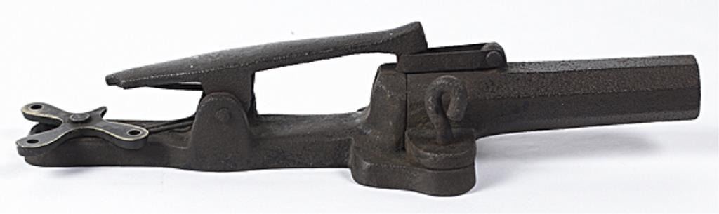 Pinfire Alarm or Trap Gun .72 bore diameter, 4.25" octagonal barrel, iron with cloverleaf shaped brass pivoting trigger. Retains traces of black painted finish. Fair to good condition. Moderate pitting on the barrel,bore rusty. Est:$200-400