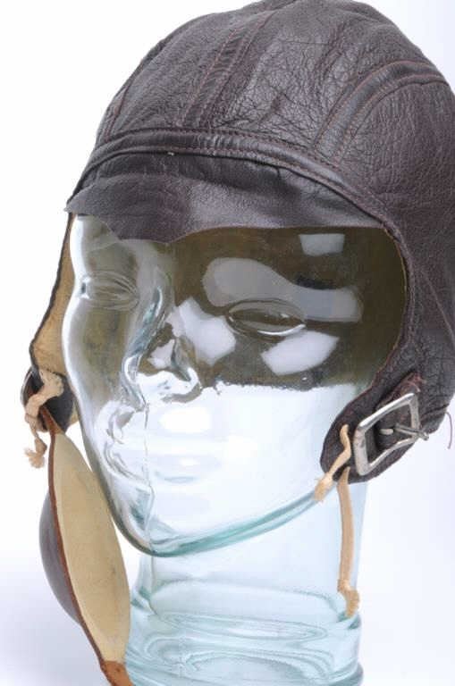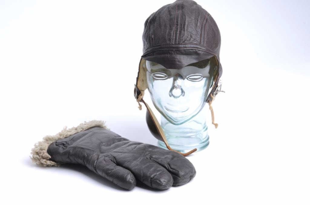 Lot 1041 Old leather Naval aviator cap with chin strap and one fur lined leather glove. Est.: $125-$2