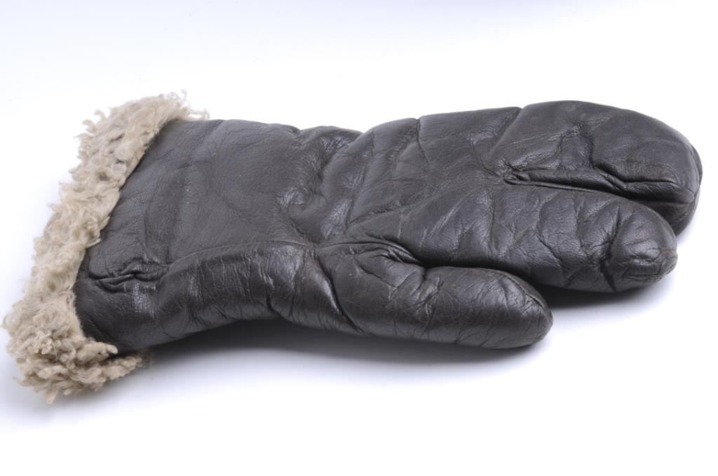 Old leather Naval aviator cap with chin strap and one fur lined leather glove. Est.: $125-$250.