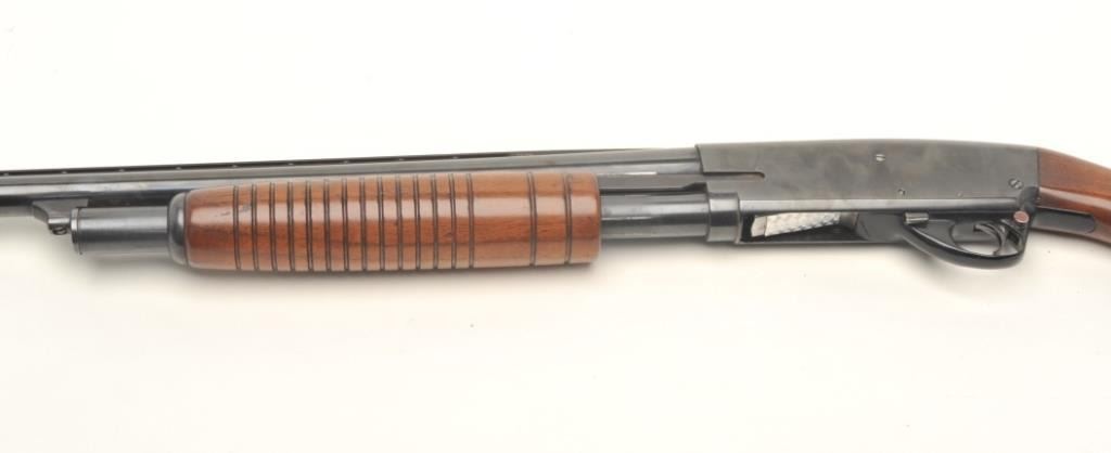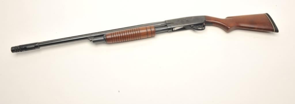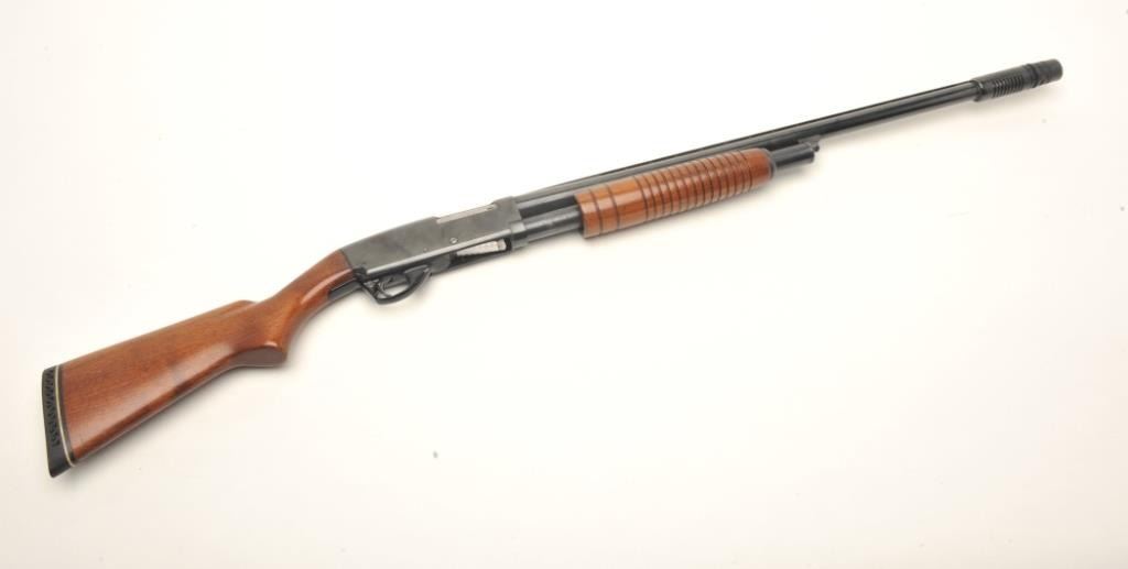 Stevens Model 77B pump action shotgun, 12 gauge, serial #NSNV. The shotgun is in very good overall condition with a 28” barrel and a Savage Super Choke added. The barrel retains the majority of its blued finish with a full-length ventilated rib and brass bead front sight. The receiver shows a significant amount of its blued finish with small scratches and mars from field use. The smooth wood stocks are in very goodcondition with only handling marks. The butt stock ends with a ventilated rubber White Line pad providing a 13 ½” LOP. The bore is dirty but should clean to good, the action functions and the markings are sharp. Est.: $150-$300. (Modern).