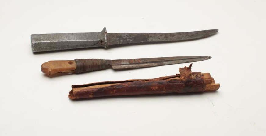 Lot of two WW II era misc. “in theater” knives, one with an aluminum grip off a Japanese Zero airplane, the other a crude jungle knife and sheath. Est.: $100-$300.