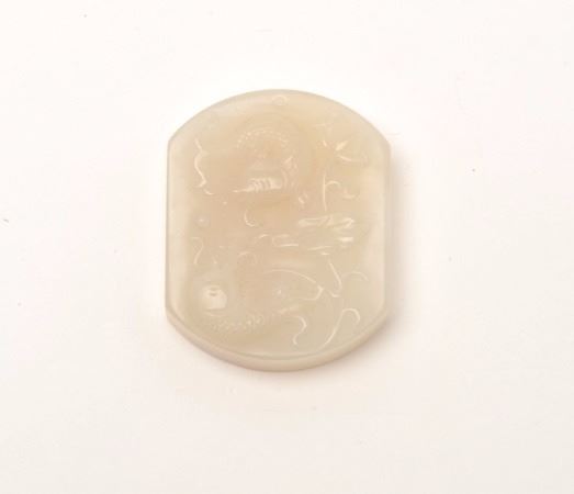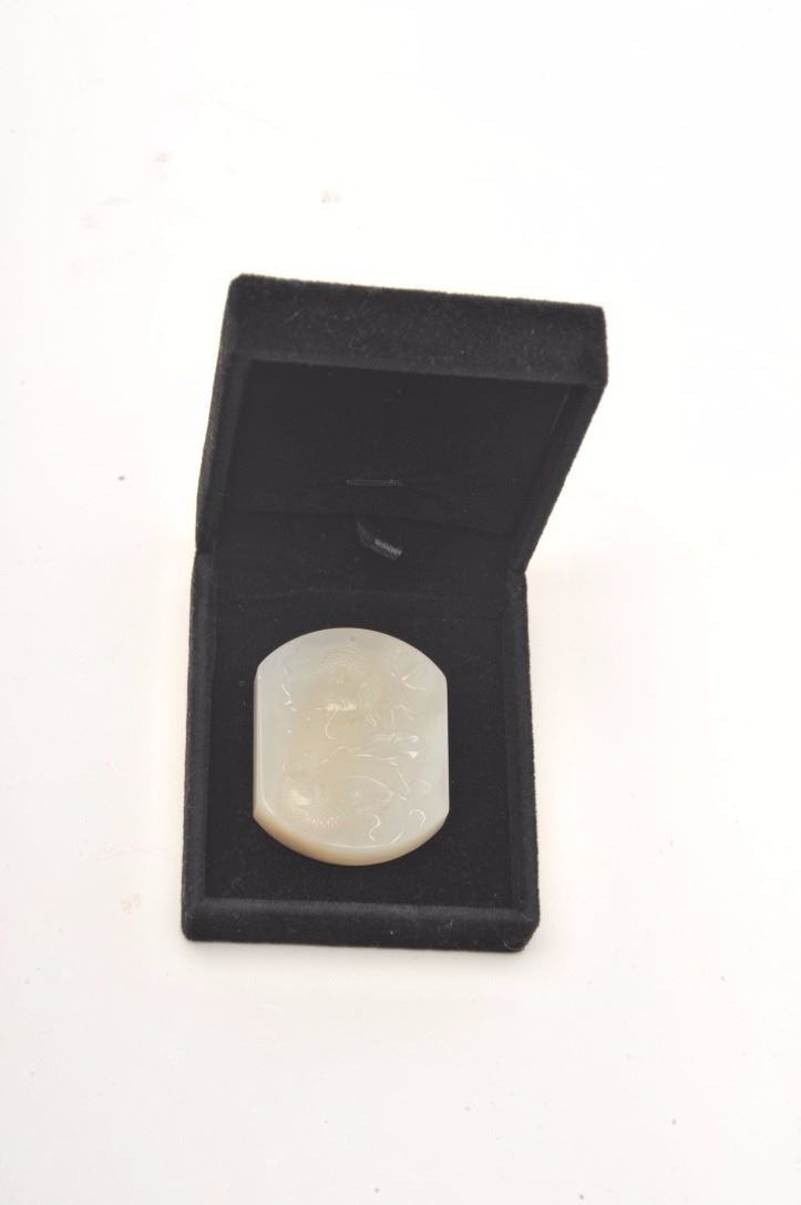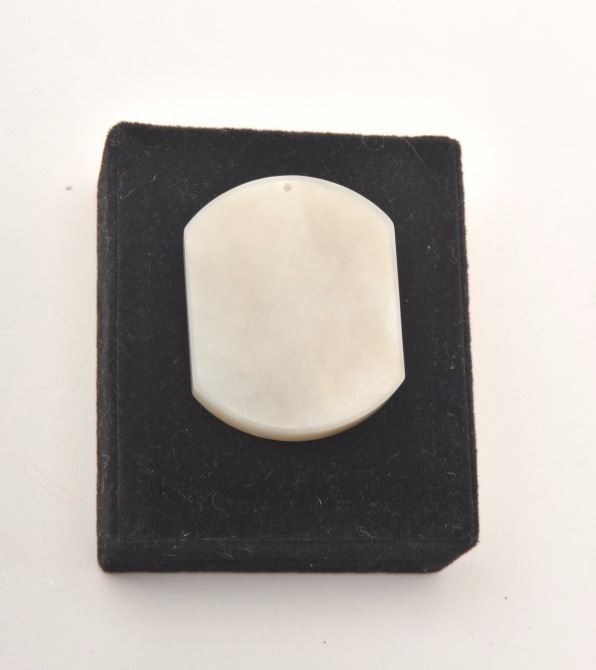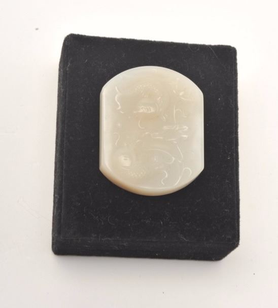 White jade beautifully carved with fish and florals. Drilled for use as pendant. Approx 1 1/2" by 1 1/4" and almost 1/4" thick. An old estate piece that is a very hard jade with slight translucence. Est. $200-$400.
