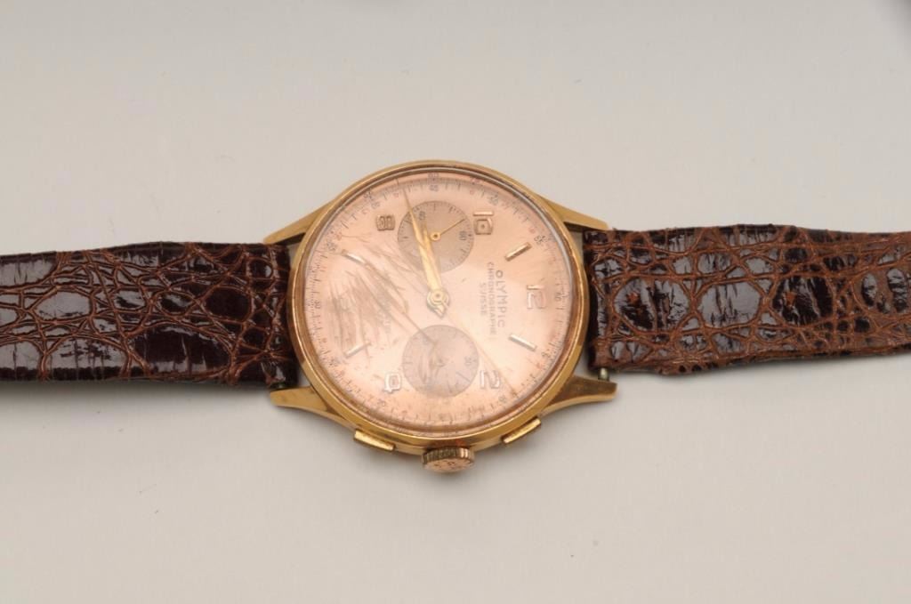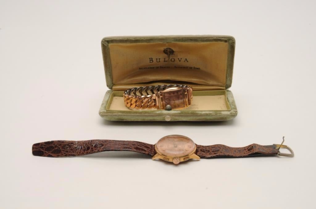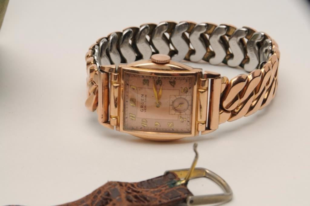 Lot of two vintage to antique wrist watches from collector. As is--condition unknown. 1. Rose gold colored oversize chronometer by Olympic. 2. Rose Gold colored Gruen wrist watch insame period Bulova box. Could be a sleeper! Est. $200-$2,000.