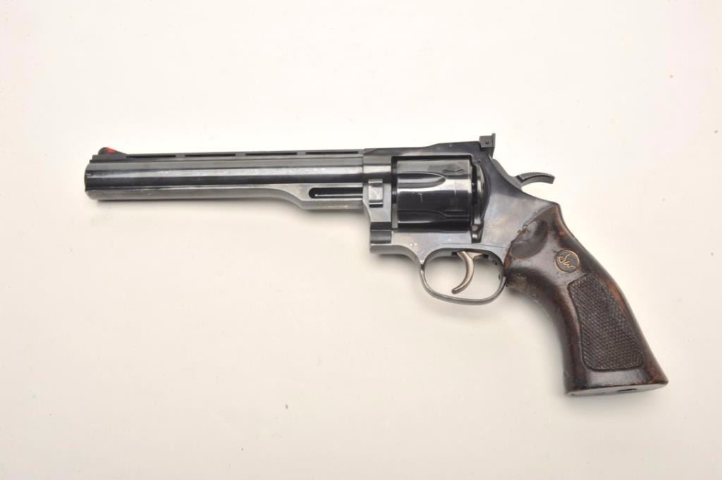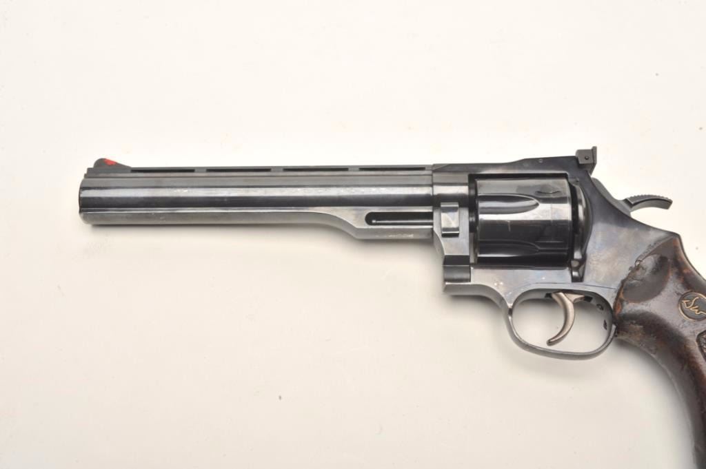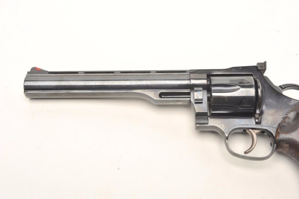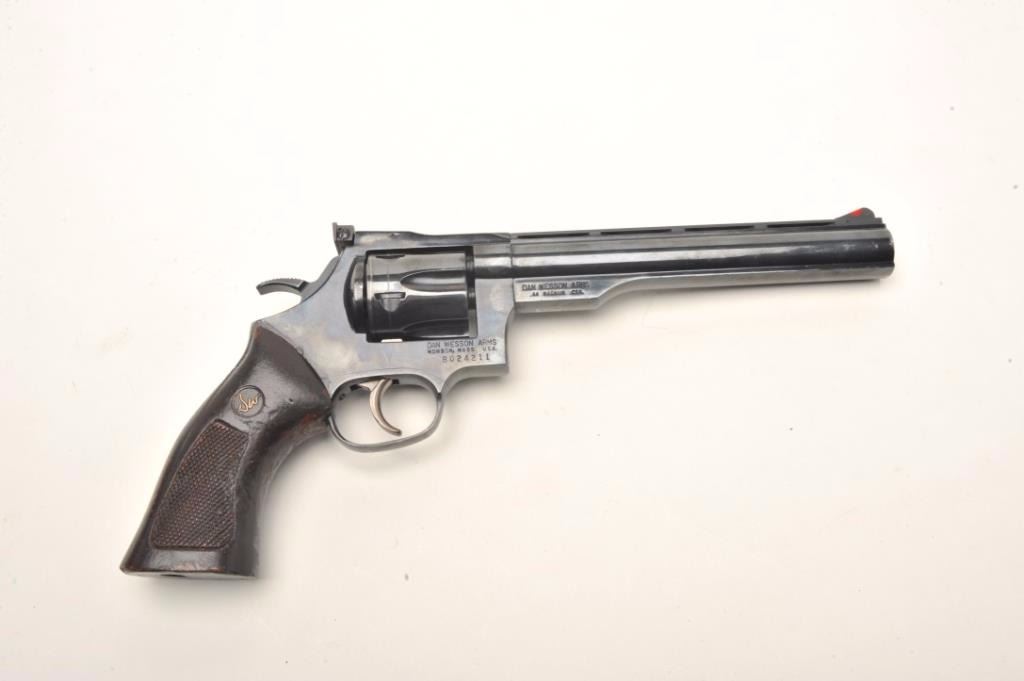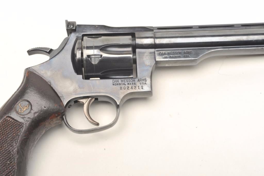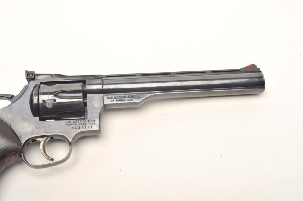 Dan Wesson Arms Co. Double Action revolver in .44 mag with a 8” barrel and vent ribs, S/N B024211. In very good used condition with 90%-95% blue remaining along with some scratches. The grips show wear and marks.Becoming collectible. (No CA Sale) Est.: $500-$1000