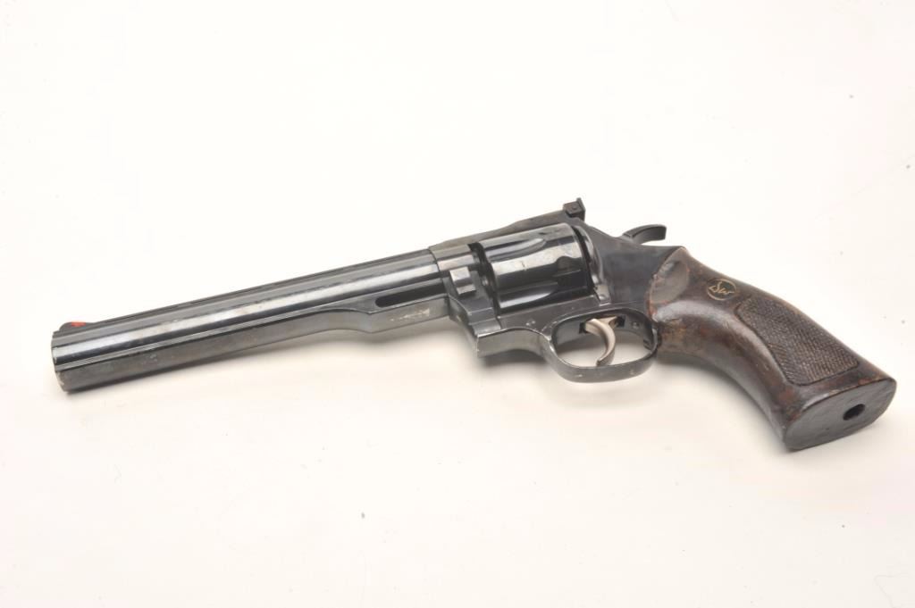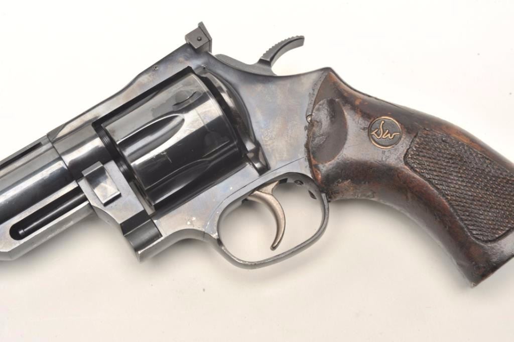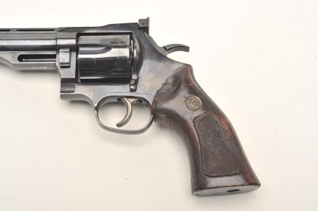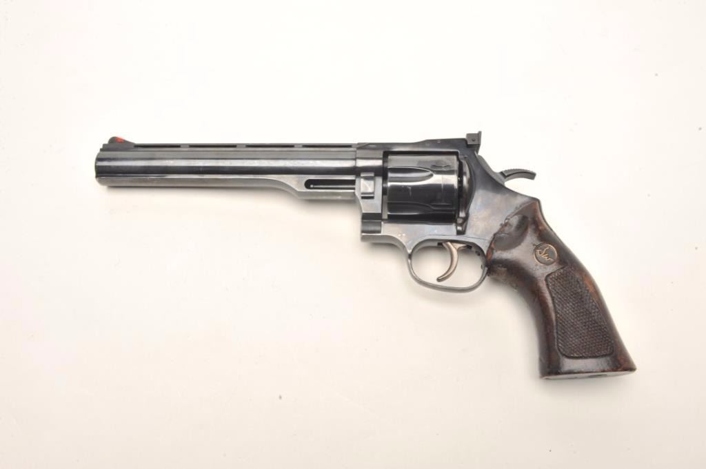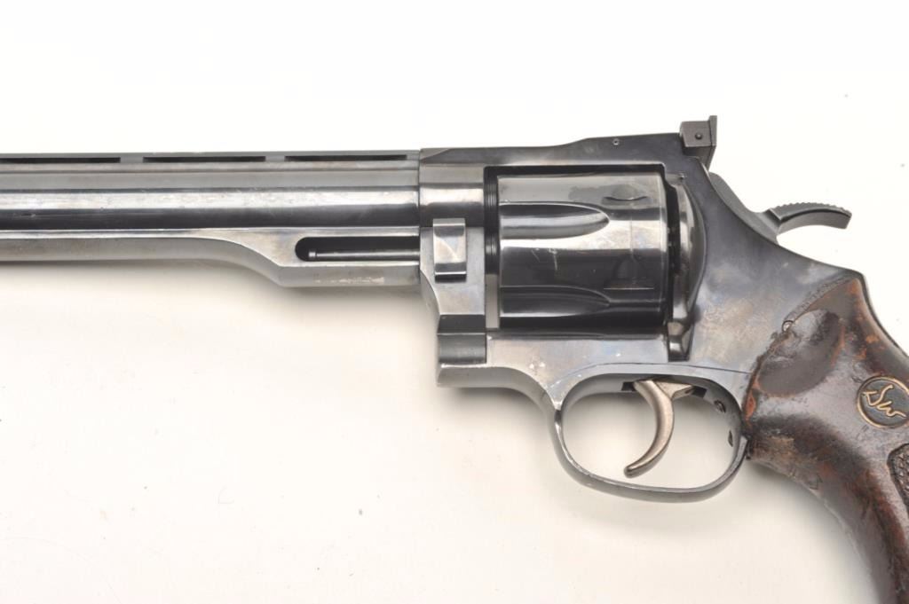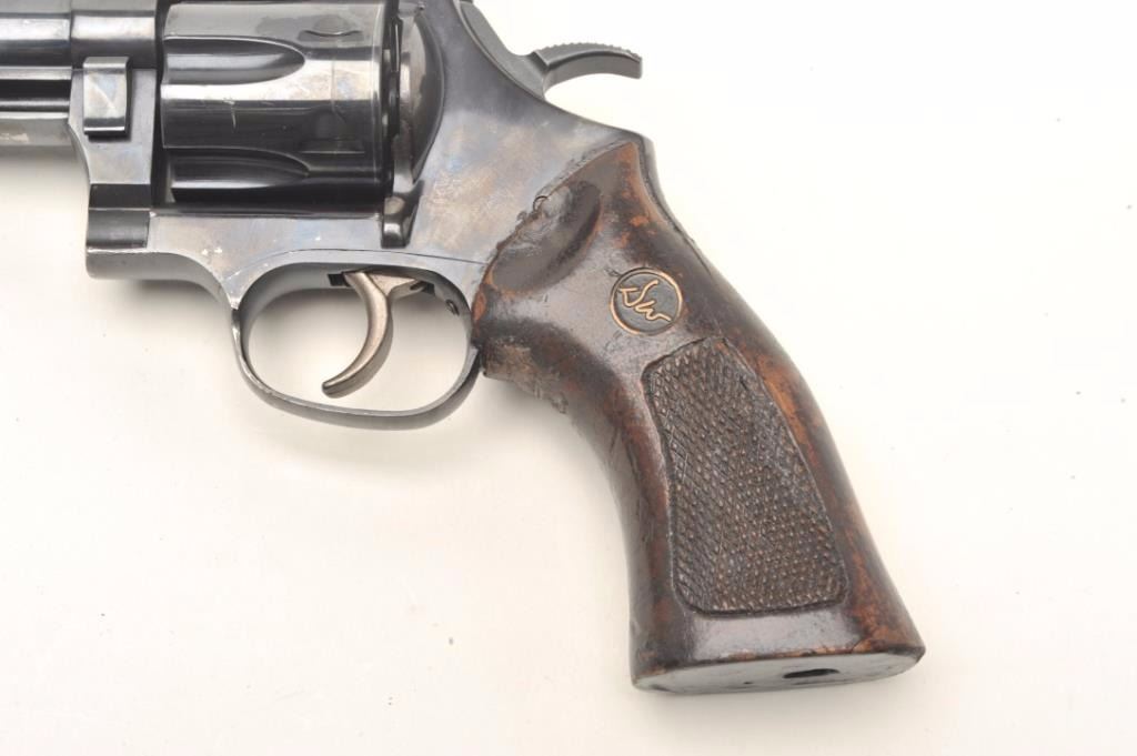 Dan Wesson Arms Co. Double Action revolver in .44 mag with a 8” barrel and vent ribs, S/N B024211. In very good used condition with 90%-95% blue remaining along with some scratches. The grips show wear and marks.Becoming collectible. (No CA Sale) Est.: $500-$1000