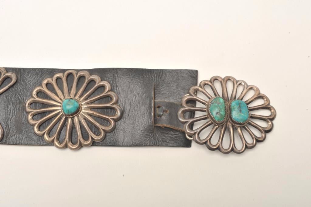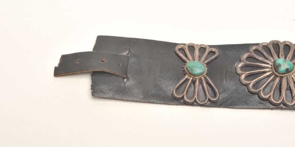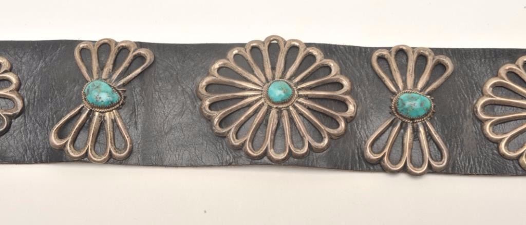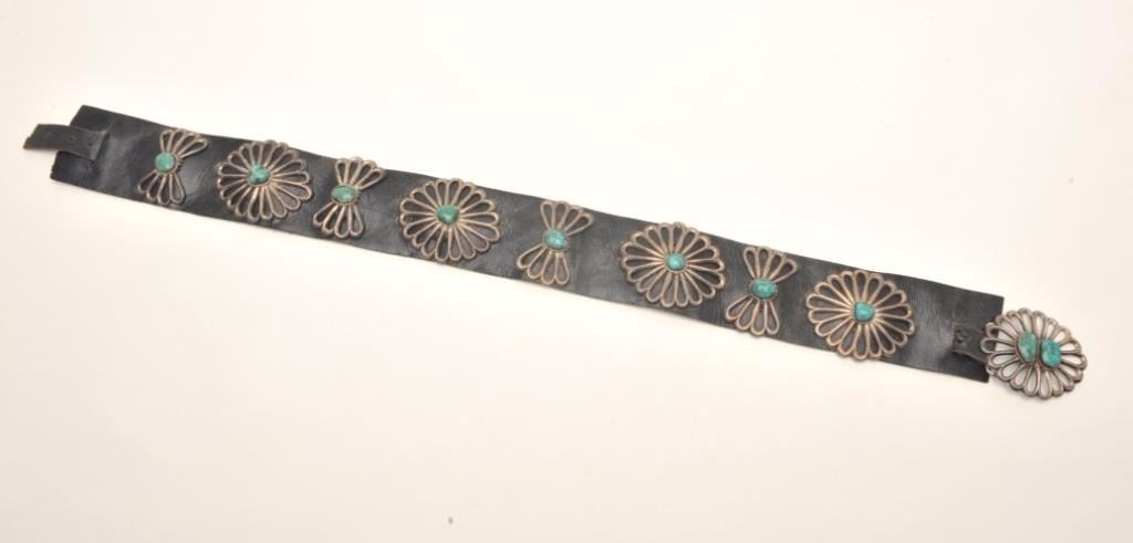 Early concho belt circa 1890-1900's with 8 conchos and buckle. Sand cast and all natural nuggets. A superior example of an early collectors piece. Retail $3,500. Est. $1,000-$2,000.