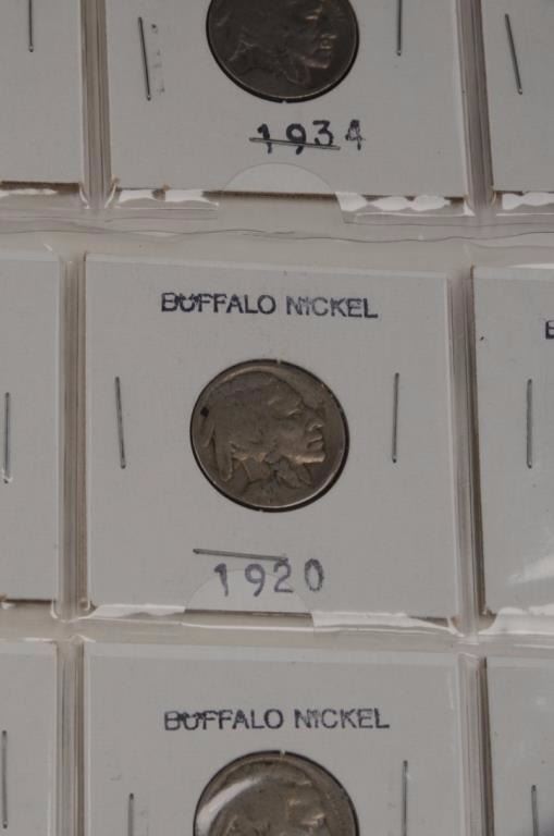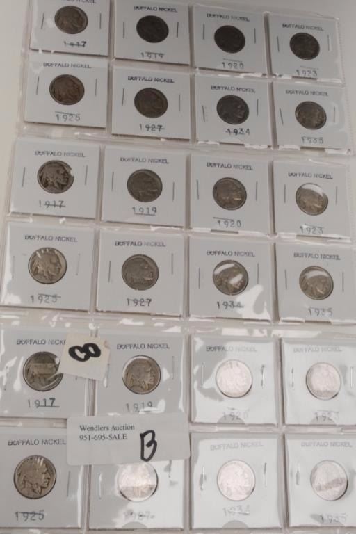 Lot of US coins. 1. 2 Morgan Dollars- 1887 toned, not graded, A-U to UNC, 1884 toned, not graded, A-U plus. 2. 25 circulated Buffalo Nickels, varied dates 1917-1934. Est. $100-$300.