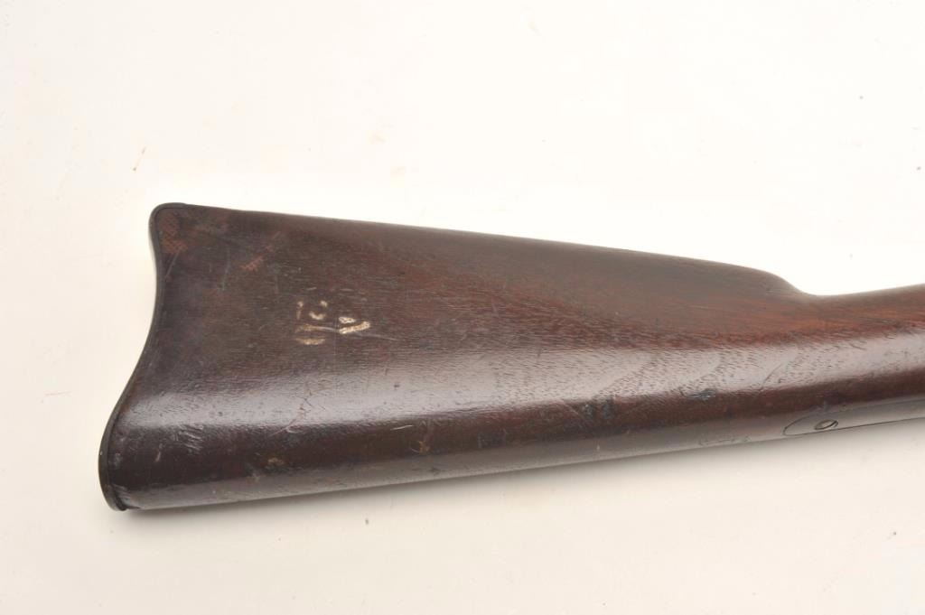 Springfield 1873 trapdoor cadet rifle in .45-70, S/N 24807. This rifle remains in good to very good condition overall showing a patina finish with traces of blue, minor pitting and good markings. The wood is goodwith traces of cartouche and normal imperfections. “A-20” is stamped in the stock with traces of cartouches outline. The action is good and the bore is fair. (Antique) Est.: $350-$700