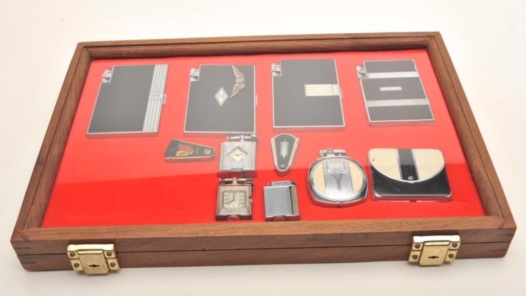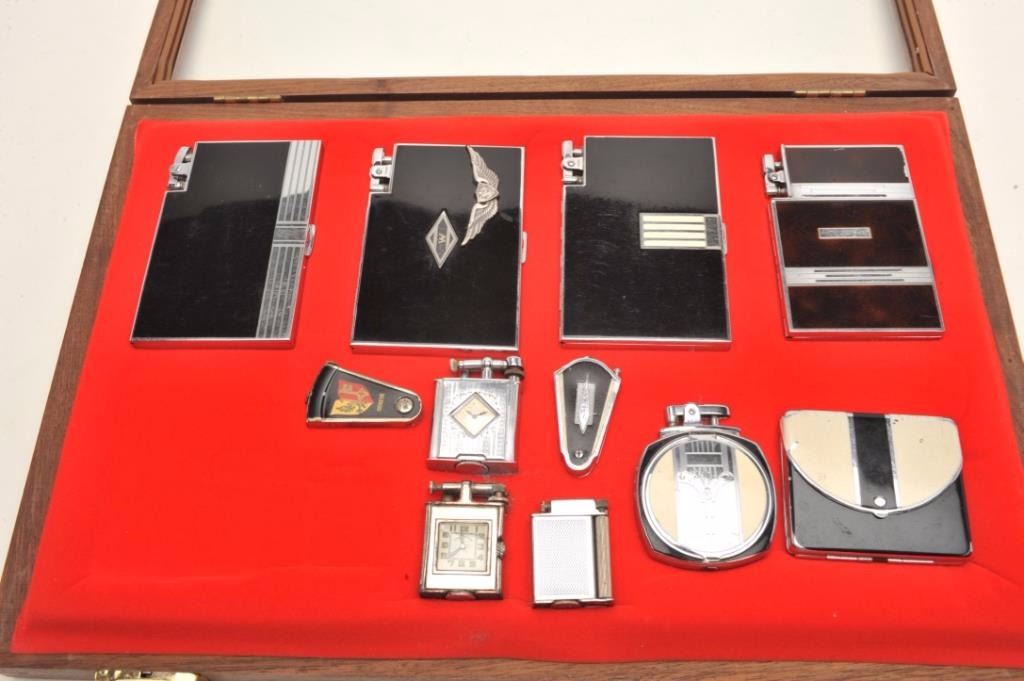 Misc. lot of vintage lighters including several combination lighter/cigarette case and 3 tabletop lighters; 11 contained in a wood and glass showcase including a chrome and enamel lighter/case by Ronson (ca.1939);a chrome and enamel lighter/case with pilot wings on front by Ronson (ca. 1939); a chrome and tow-toned enamel cigarette case by Ronson (ca. 1930). etc.; desktops include a “Classic” model by Ronson (ca. 1938).(Reference: James Flanagan’s definitive work “The Big Book of Cigarette Lighters”). Est.: $350-$500.