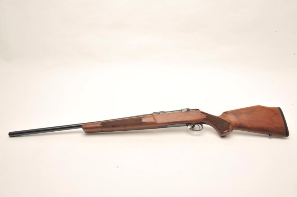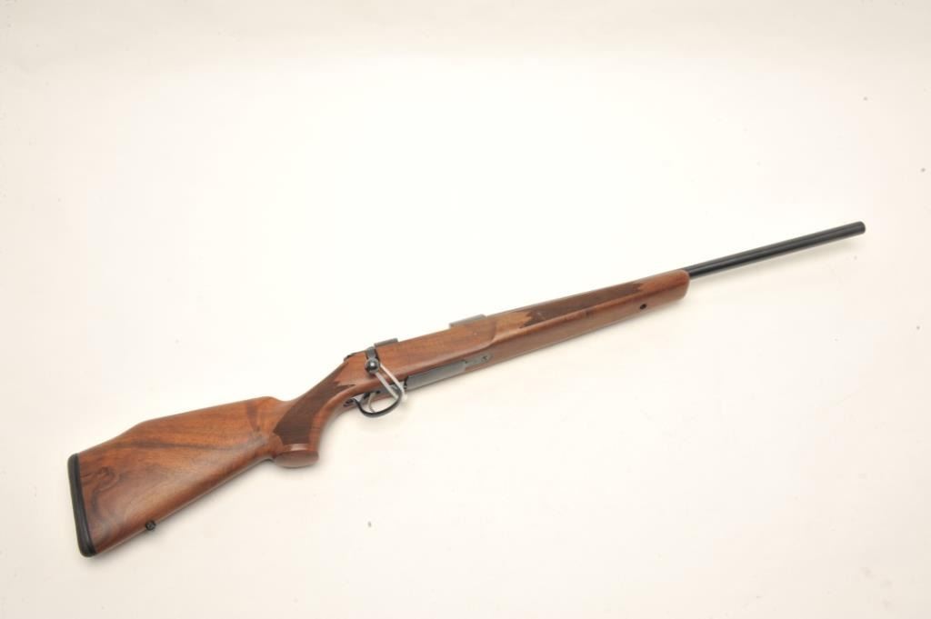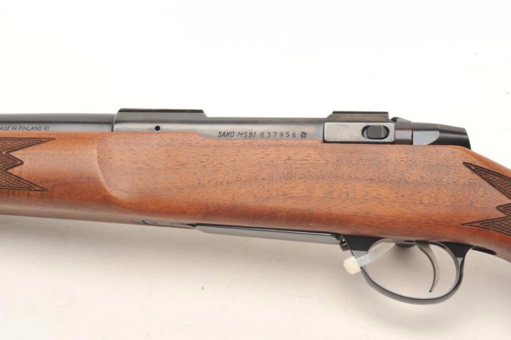 Sako M591 heavy barrel sporting rifle in 7mm-08 Rem. Caliber and”Made in Finland” marked. The barrel measures 24 ¾”. No sights and thin line recoil pad. In excellent used condition with storage marks that are minimal and possible slight use. S/N 837956. Shows double bridged Mauser style action with claw extractor. Est.: $700-$1400